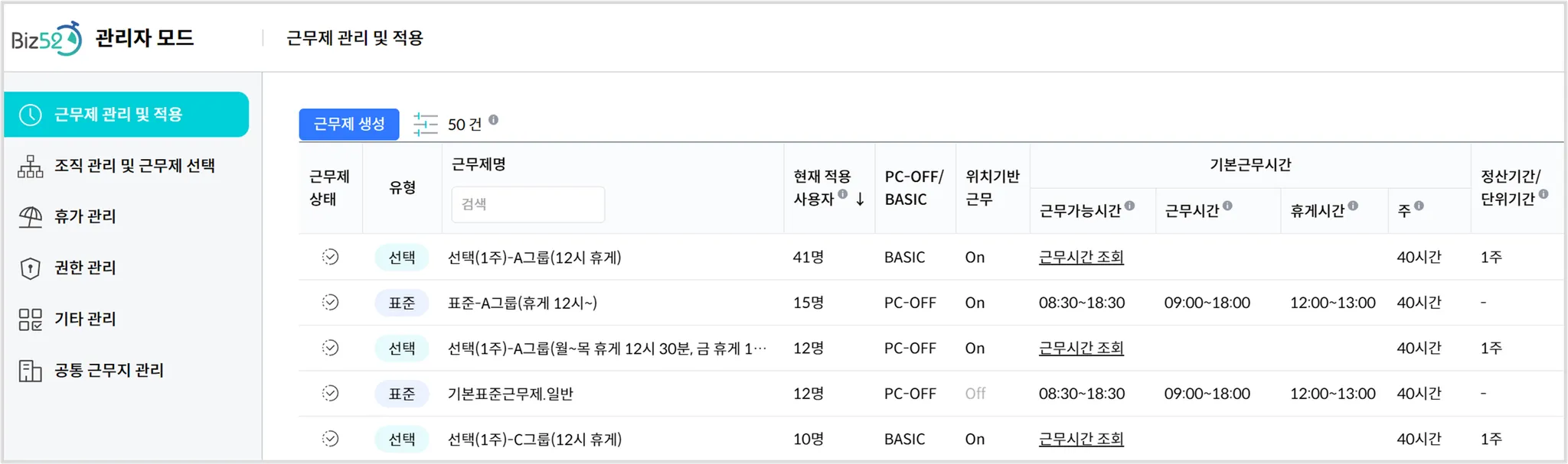 관리자 모드> 근무제 관리 및 적용에서 생성된 근무제 목록을 확인할 수 있습니다.