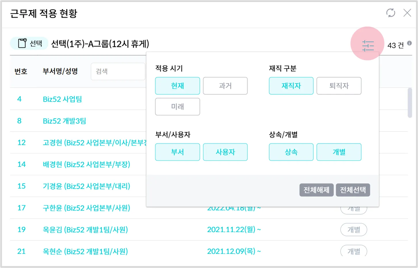 ‘(선택)1개월 정산’ 근무제의 적용 현황에 들어가서 다음과 같이 필터를 설정하면 됩니다.