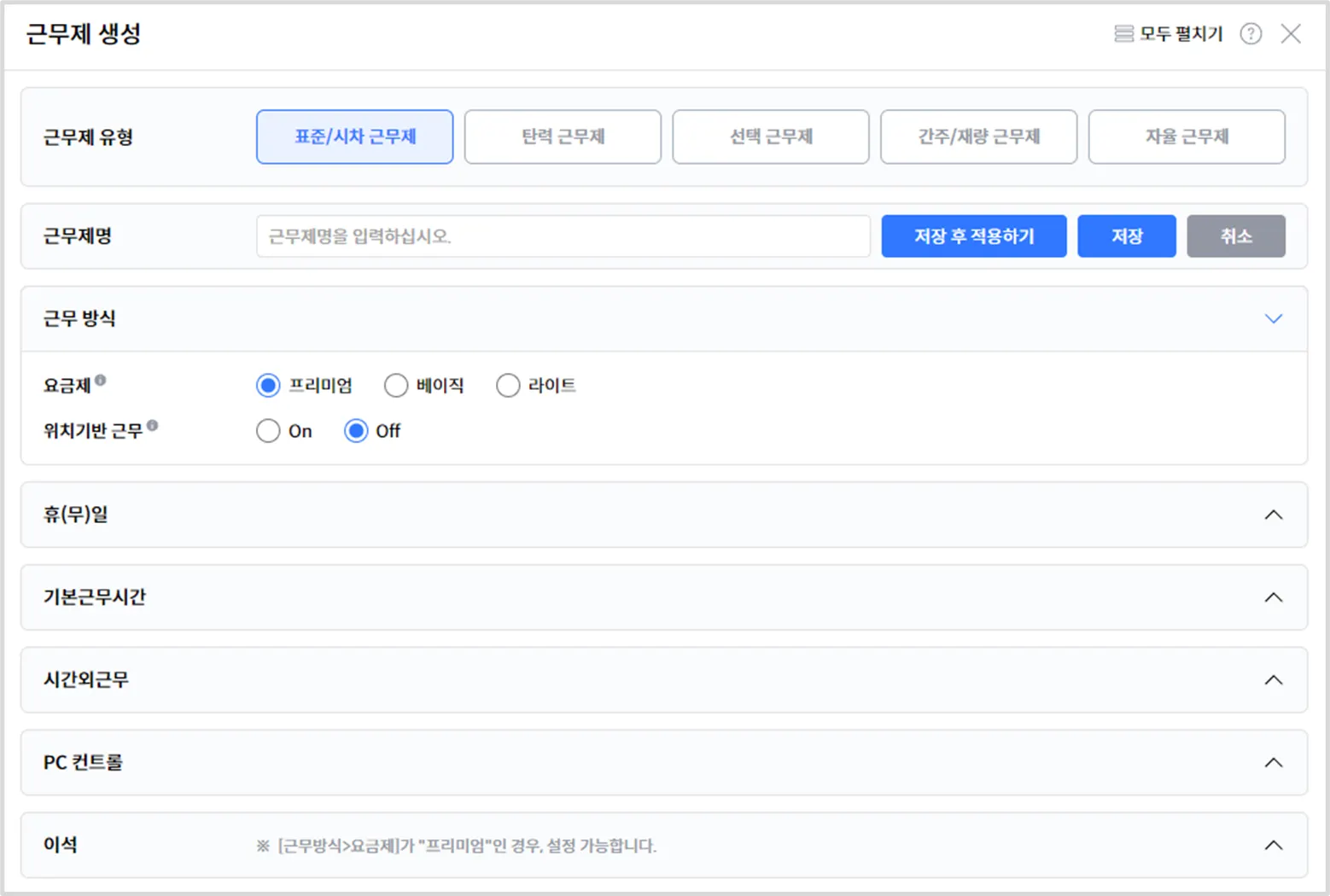 아닙니다! 근무제 만들어서 저장 한 후 따로 적용할 수 도 있습니다.