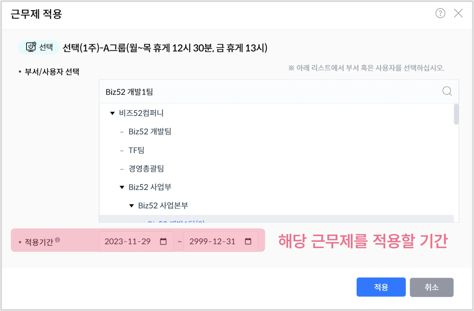 생성할 근무제 설정을 마치고 근무제명 옆에 있는 저장 후 적용하기 버튼을 누르면 위와 같이 적용 창이 나옵니다. 부서 트리에서 적용 원하는 부서/사용자를 선택 후 적용 버튼을 누르면 완료!
