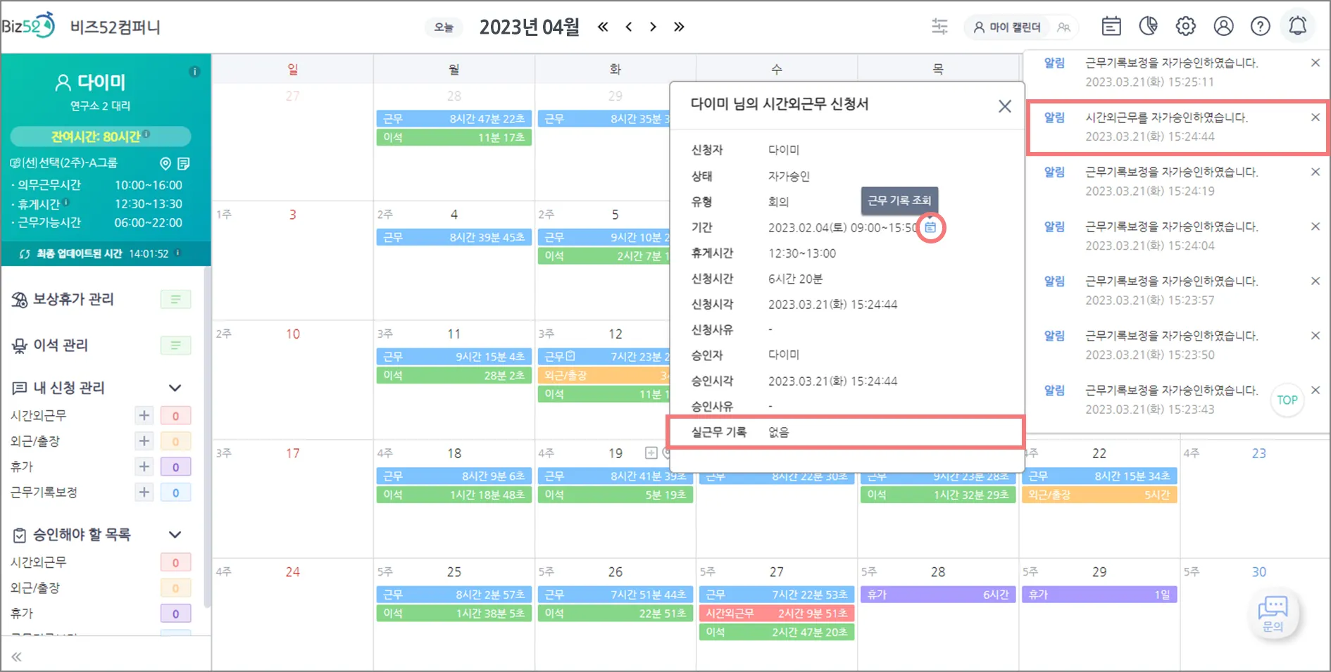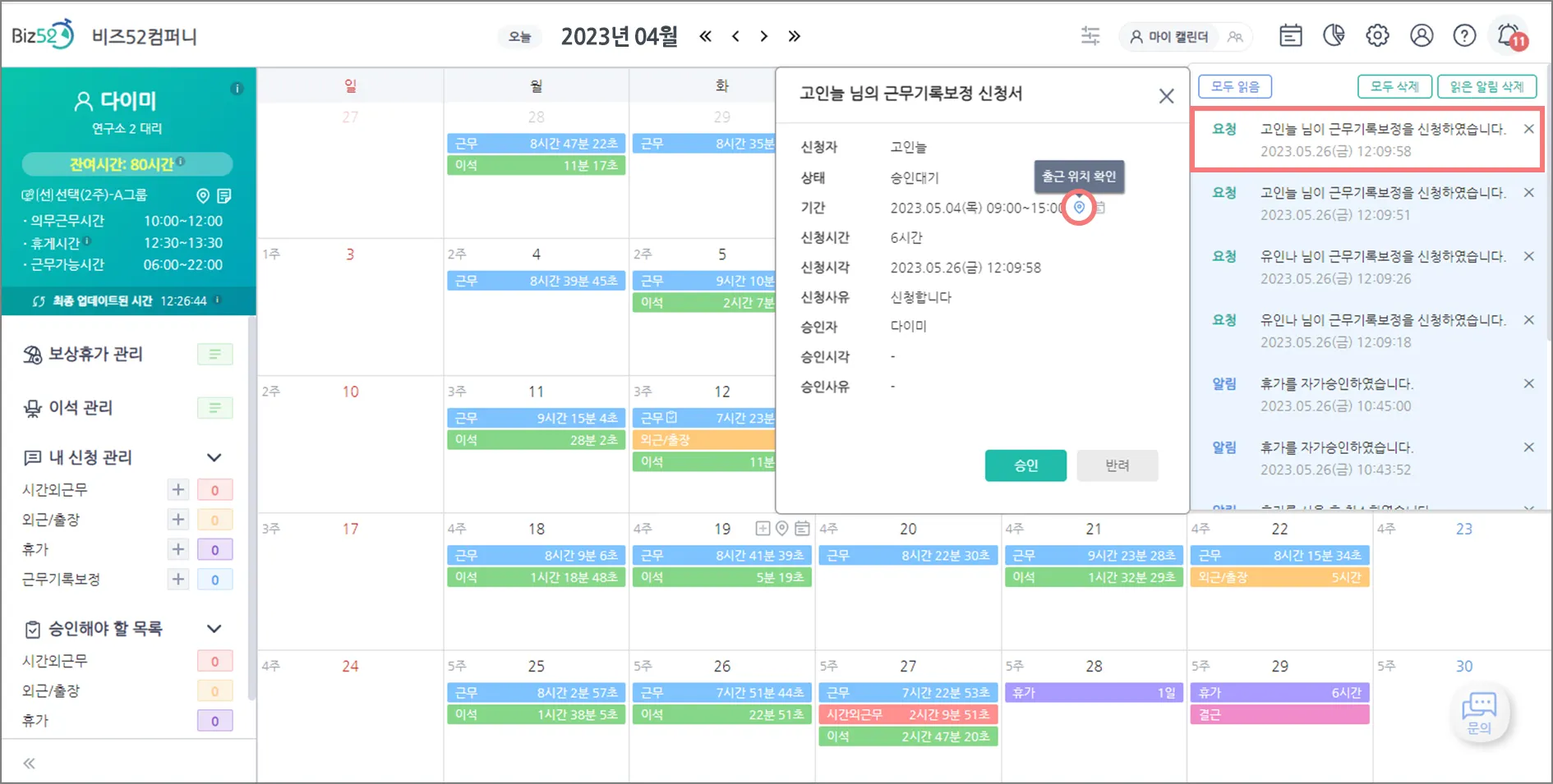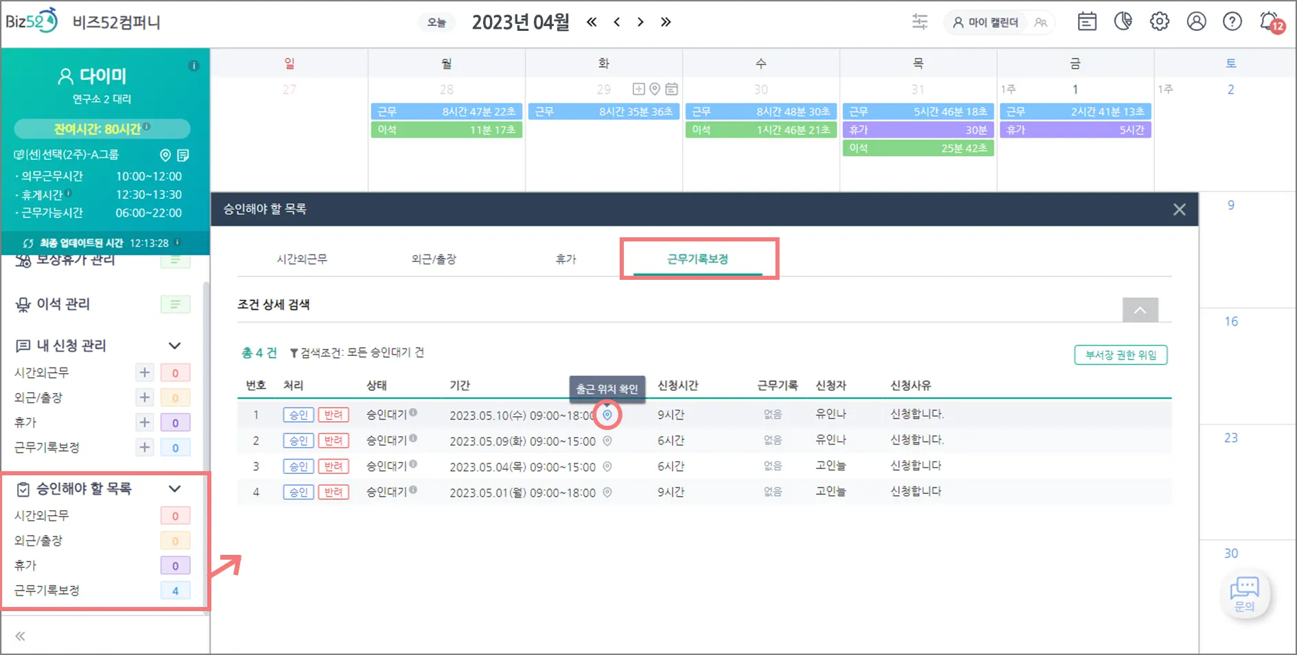 근무기록보정 신청에 대해 실제 어떻게 기록되었는지 궁금하다구요?