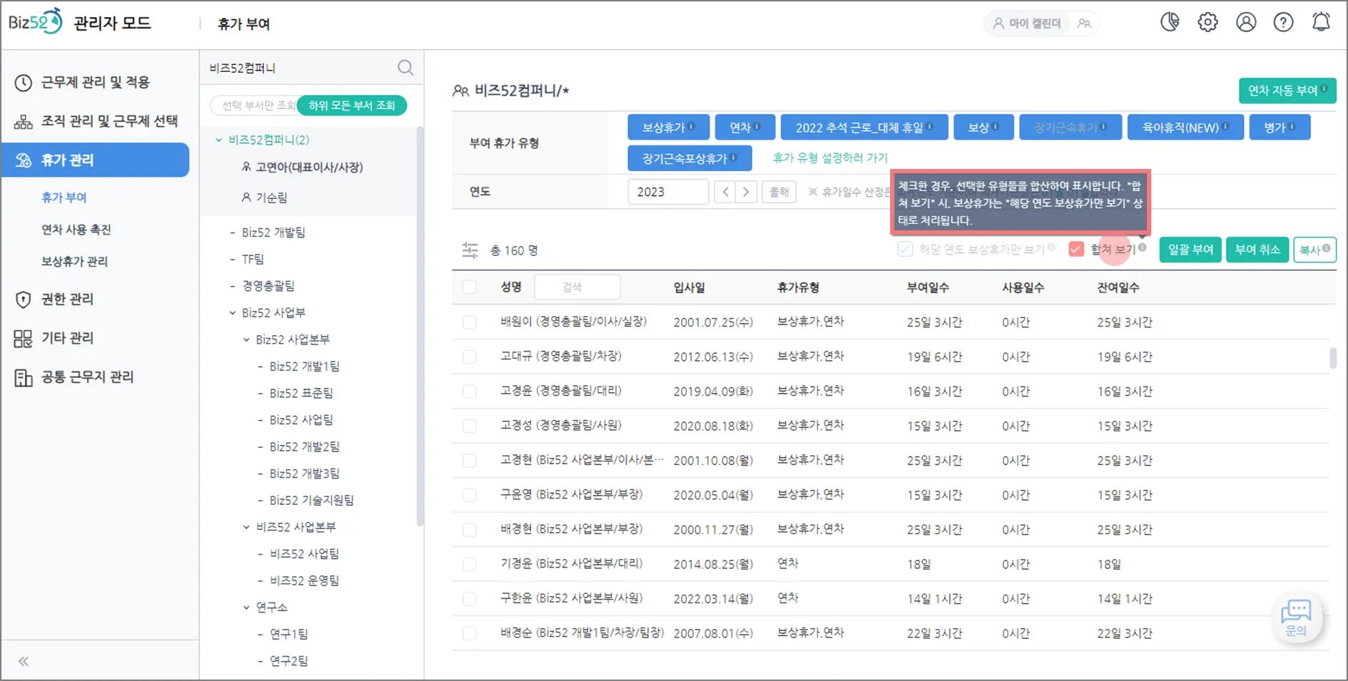 11. [관리자 모드>휴가 관리>휴가 부여] “합쳐보기” 기능 추가 및 [보상휴가] 관련 조회 기능 개선