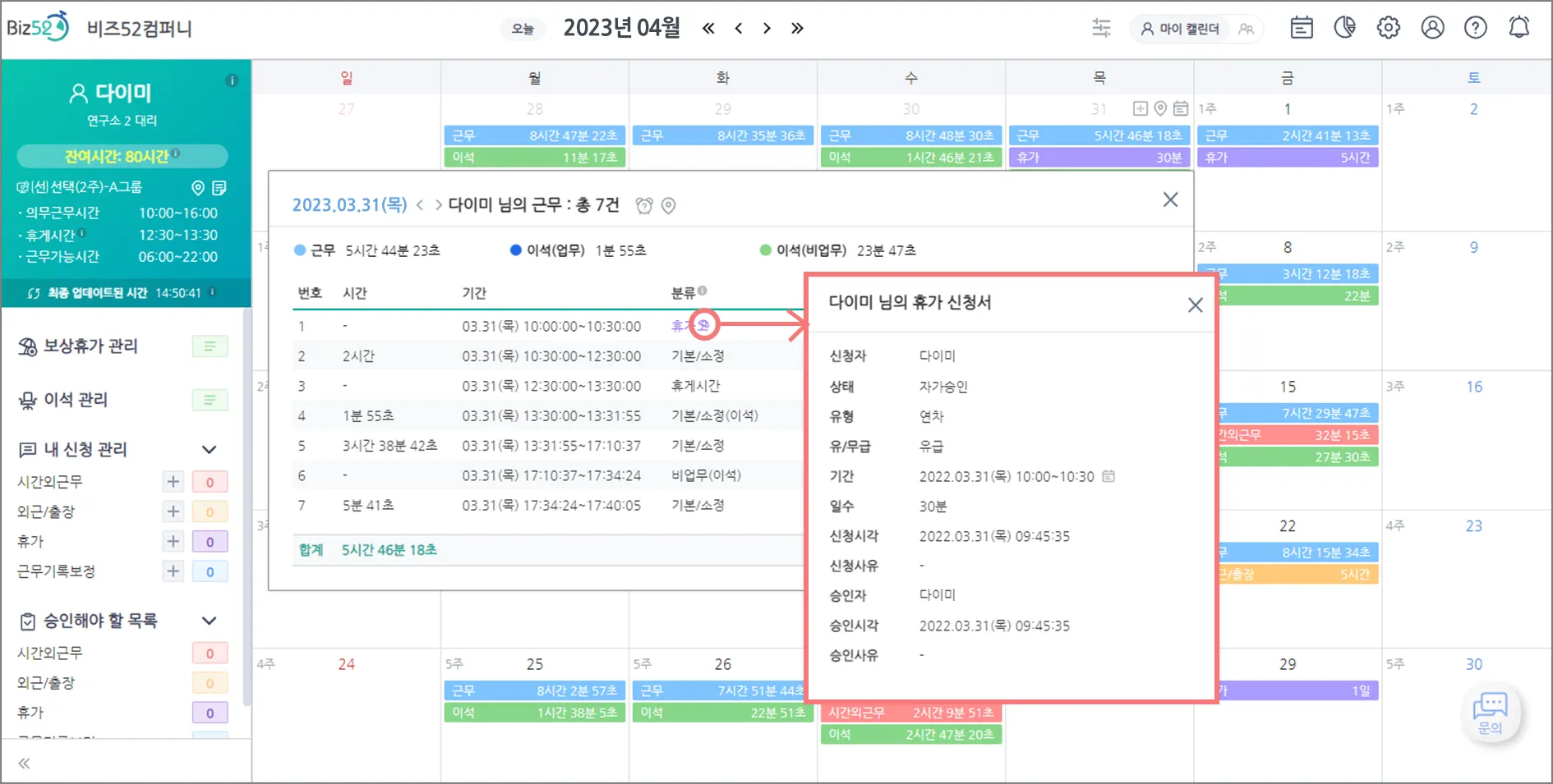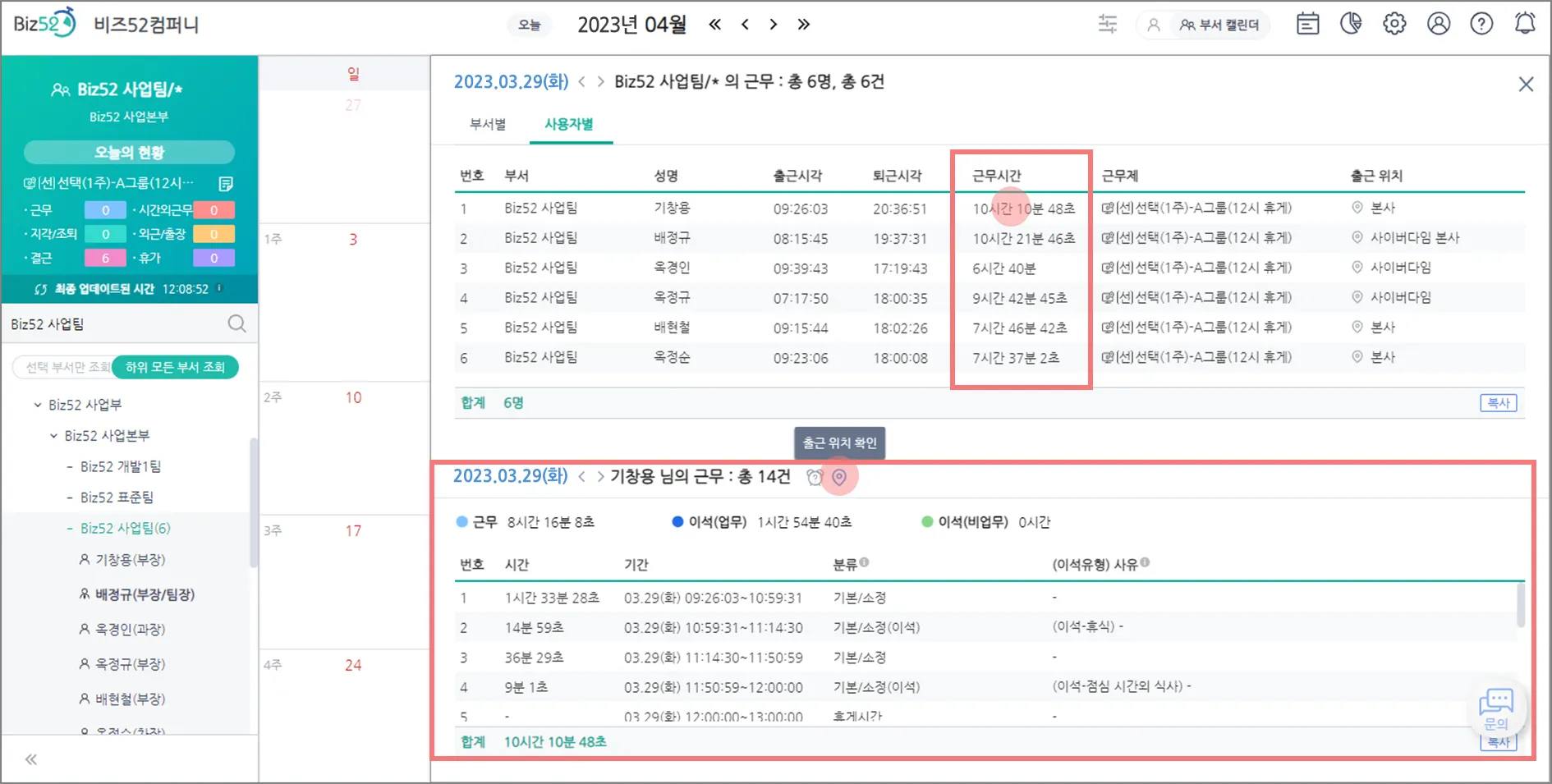 [부서 캘린더] 상세 조회  중 근무 내역이 궁금한 사용자가 있다면?