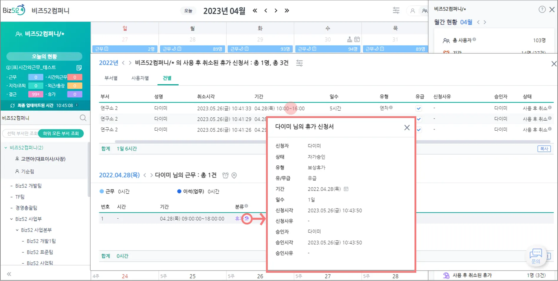 7. [부서 캘린더] “사용 후 취소된 휴가” 상세 조회 창에 개별 근무 조회 창 추가