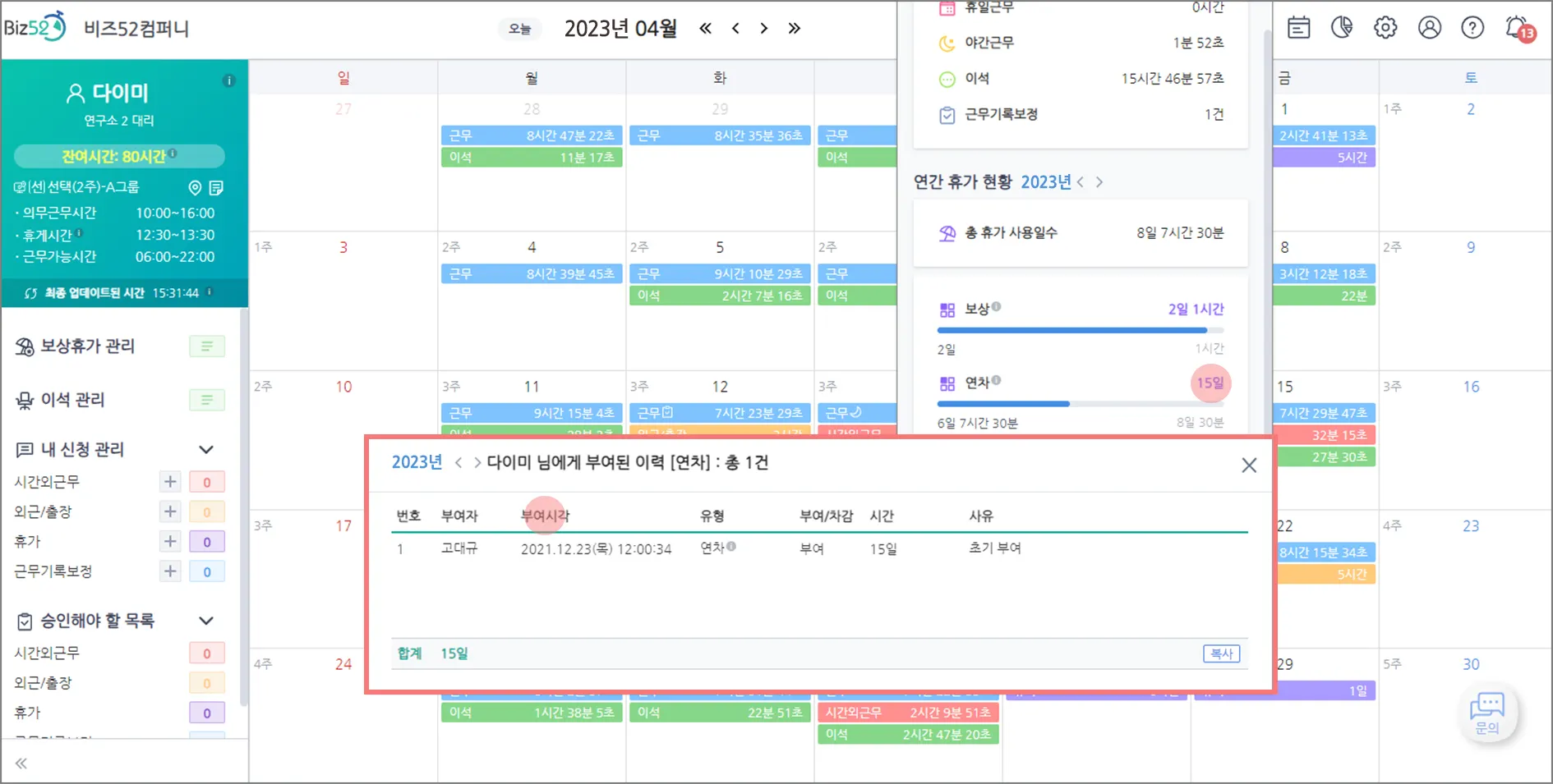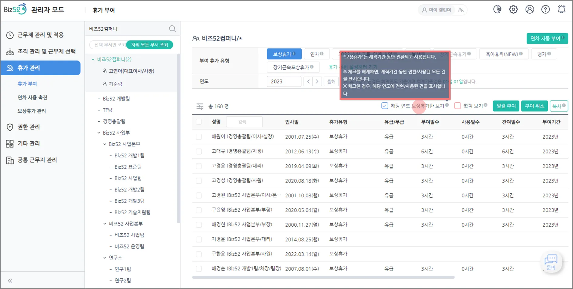 ‘휴가 부여 이력’은 [관리자 모드]에서만 제공되어 사용자들은 본인에게 부여된 이력을 확인할 수 없었는데요,