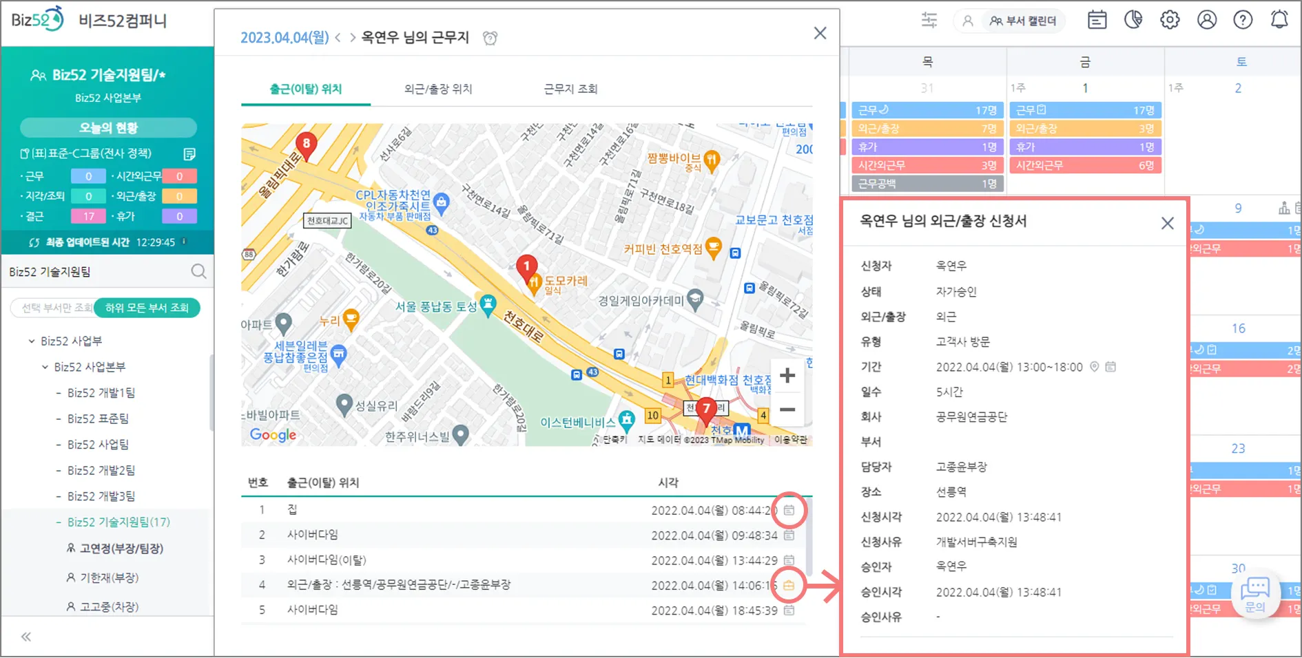 ‘출근 위치 확인’ 아이콘이 추가되어 상세 조회 중에도 바로 ‘지도’를 열어볼 수 있구요,