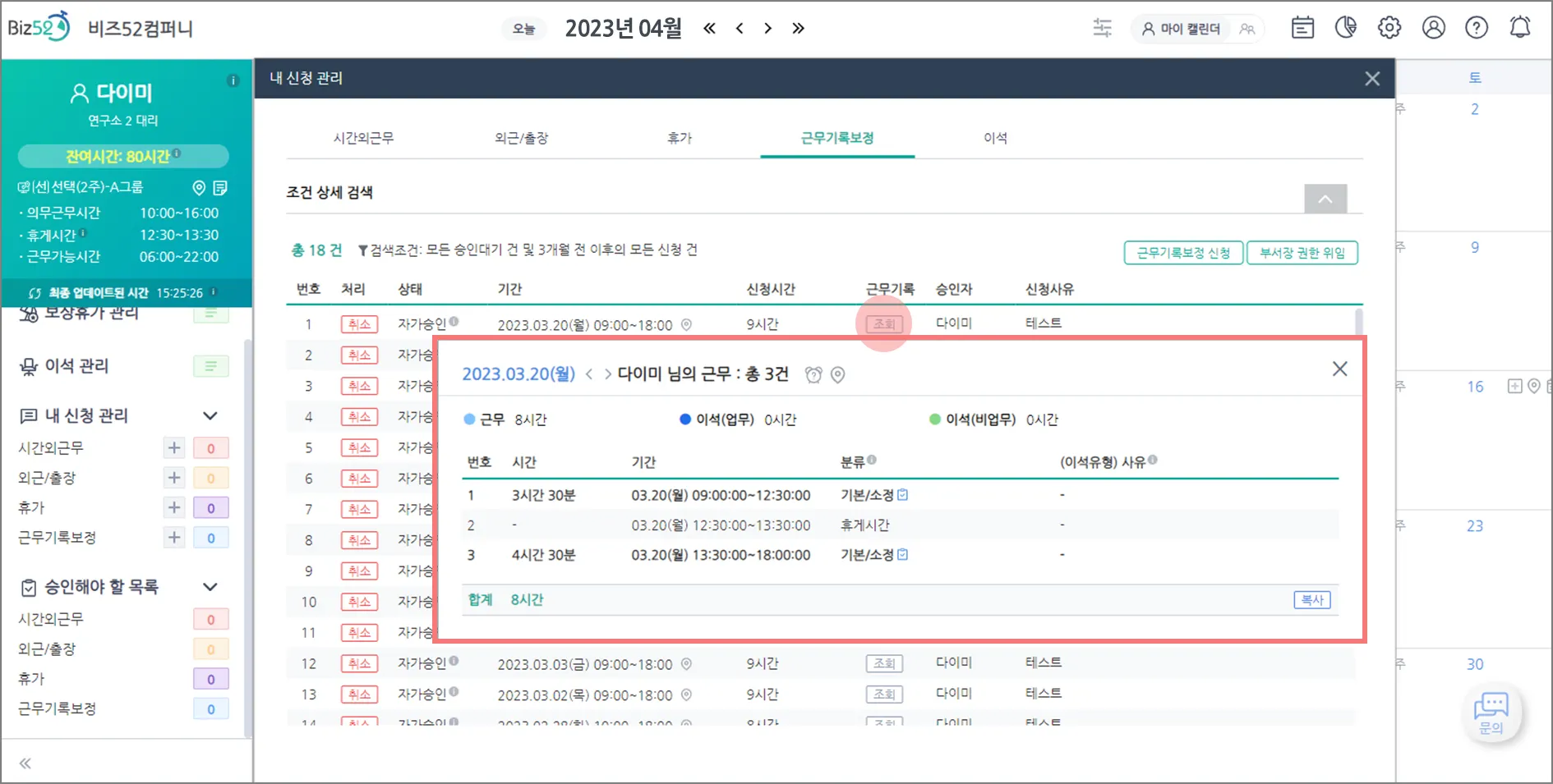 2. [웹 캘린더] “내 신청 관리/승인해야 할 목록>근무기록보정”에 “근무기록” 컬럼 추가