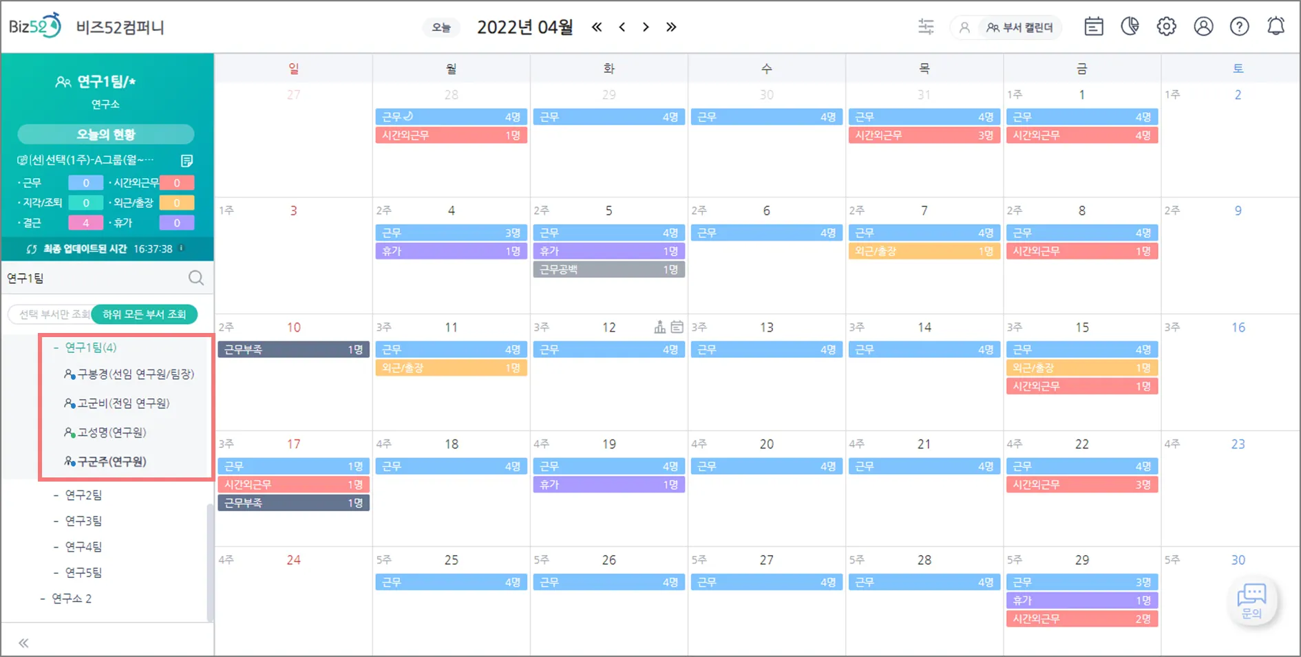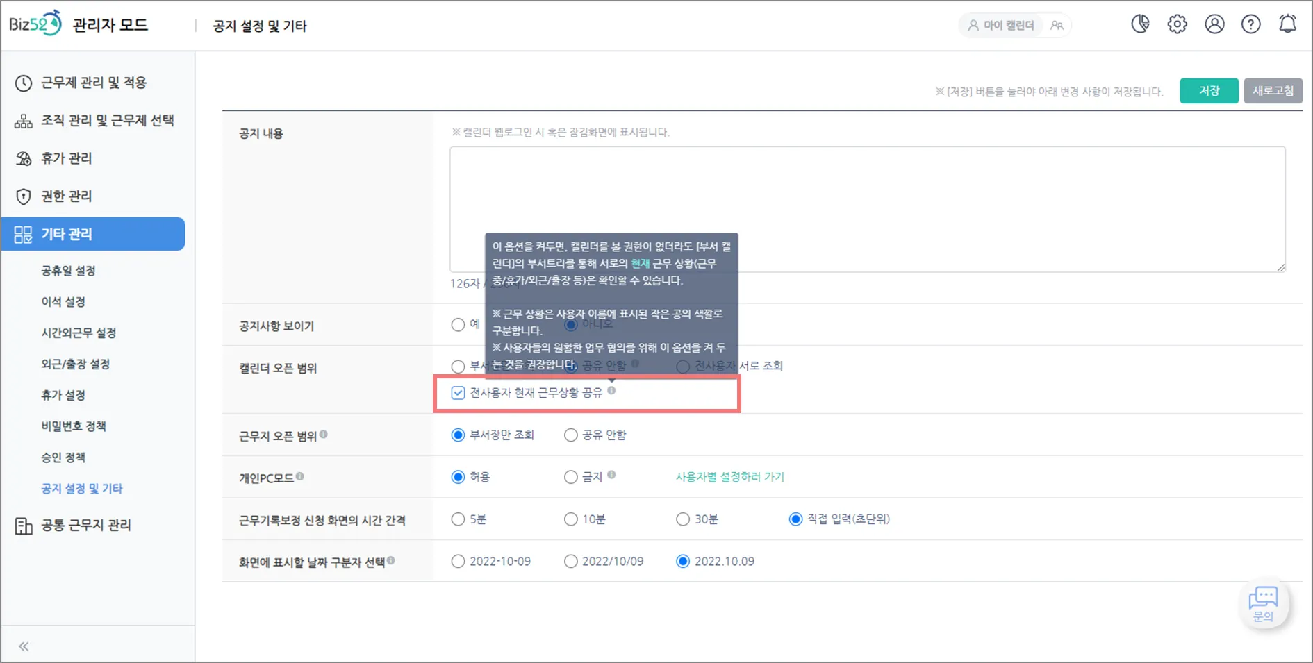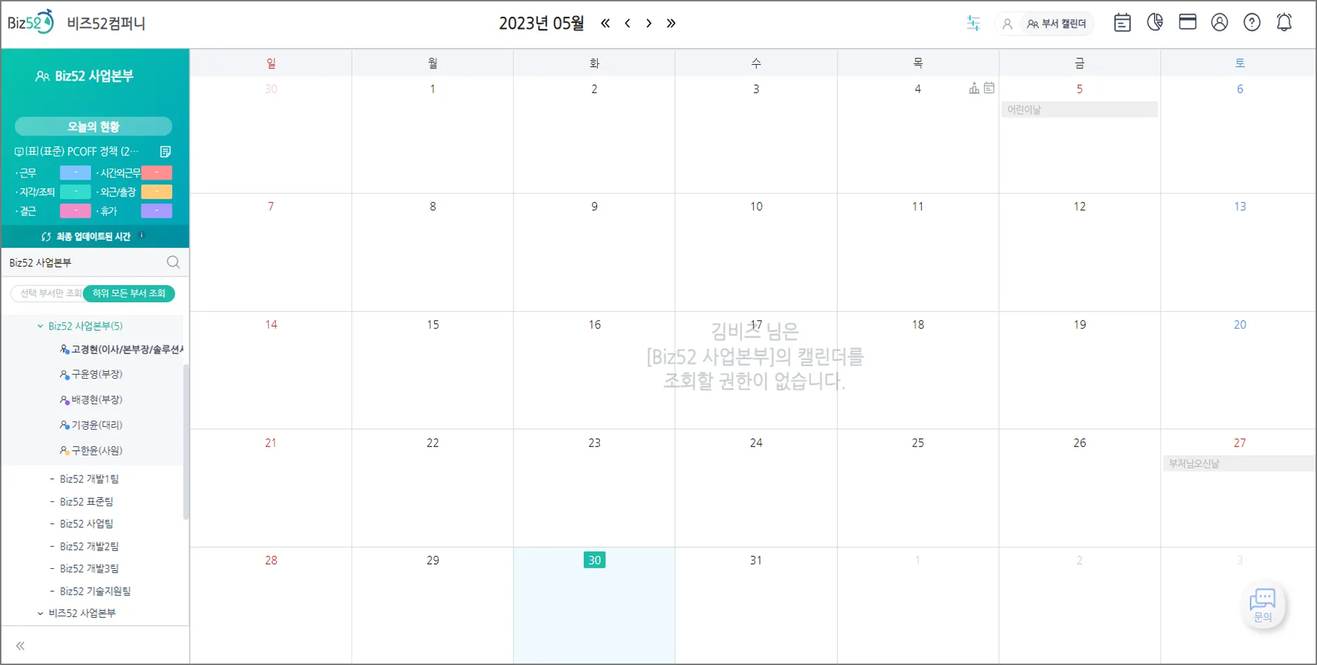 ‘캘린더 오픈 범위’를  부서장만 조회로 설정하더라도 타 부서원의 실시간 근무 현황은 좀 알 수 없을까?