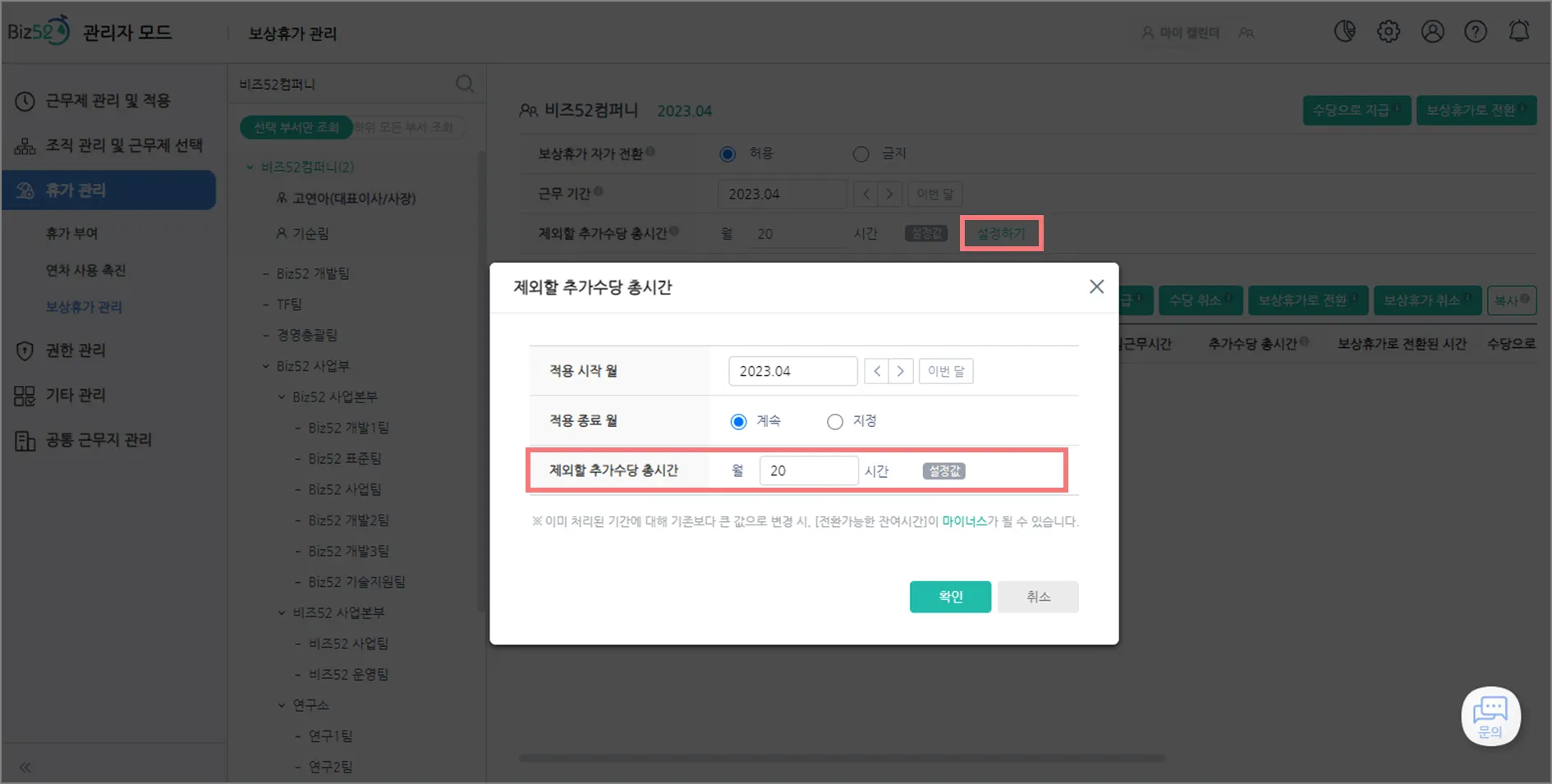 ‘관리자 모드>휴가 관리>보상휴가 관리’에 추가된  “제외할 추가수당 총시간”을 20시간으로 설정하세요.