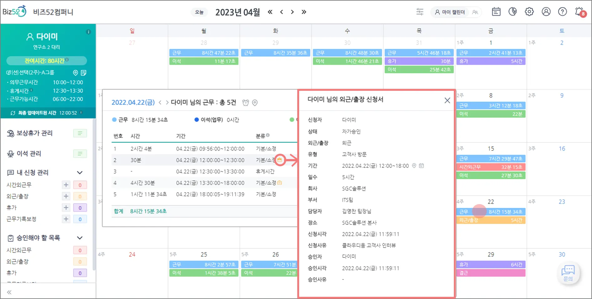 “휴가” 아이콘, “외근/출장” 아이콘을 클릭하면 신청서 상세 내용도 바로 확인 할 수 있답니다.