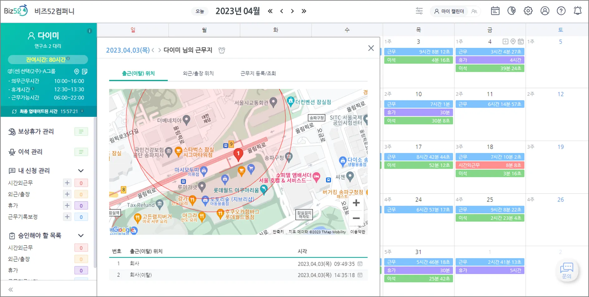 6. [웹 캘린더] “출근(이탈) 위치” 지도에 “근무지 인식 반경” 표시 추가