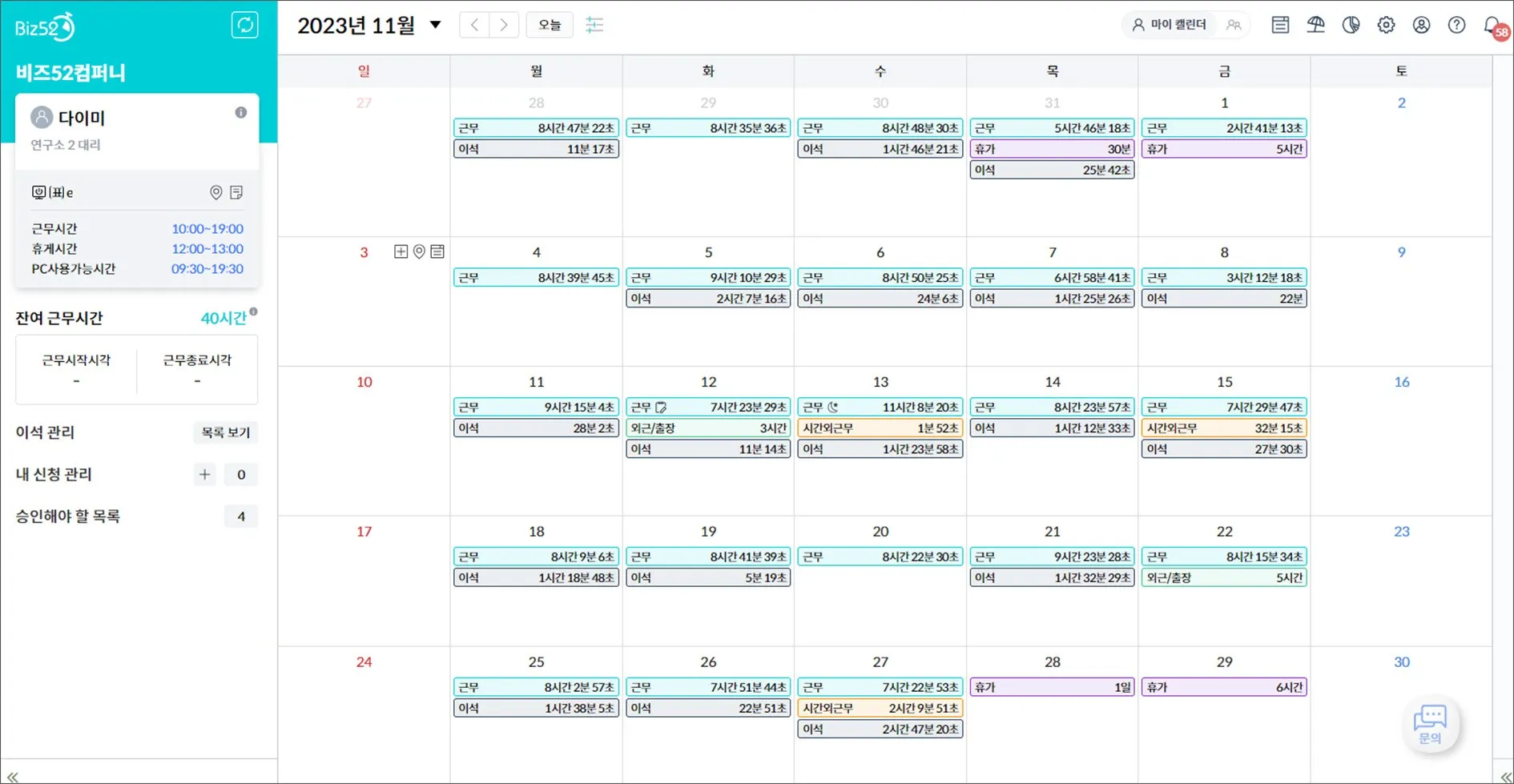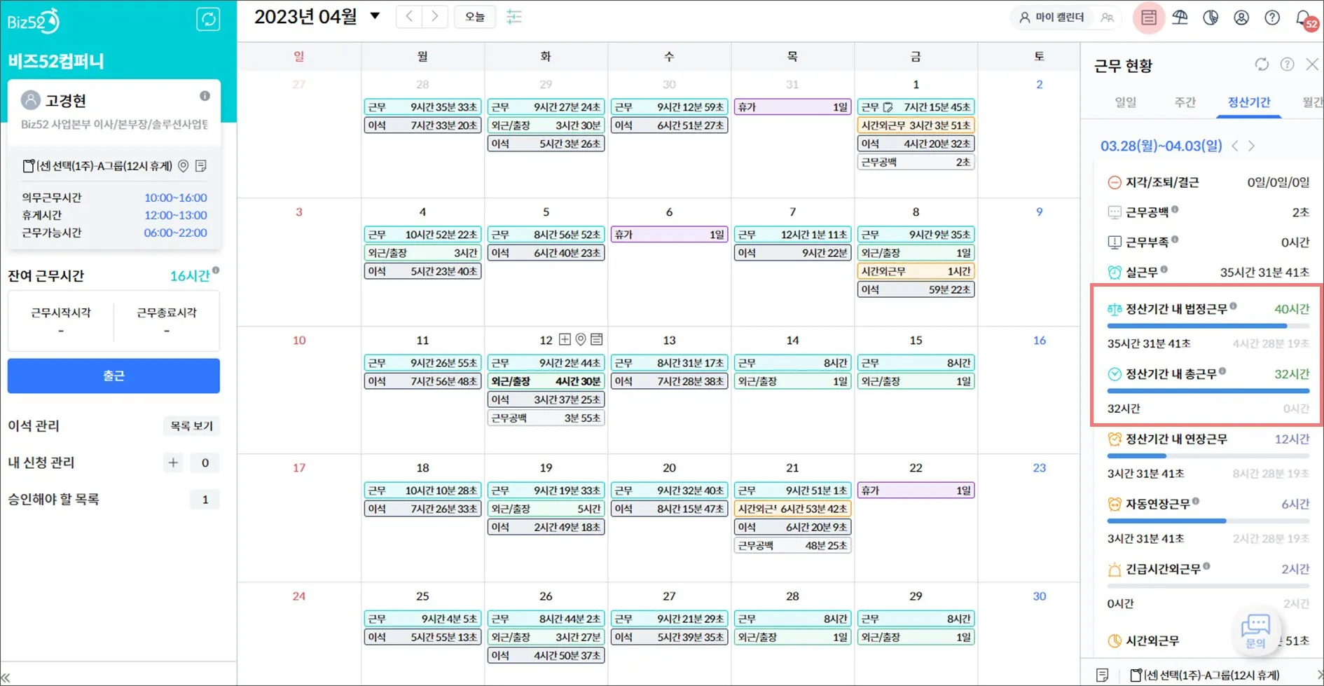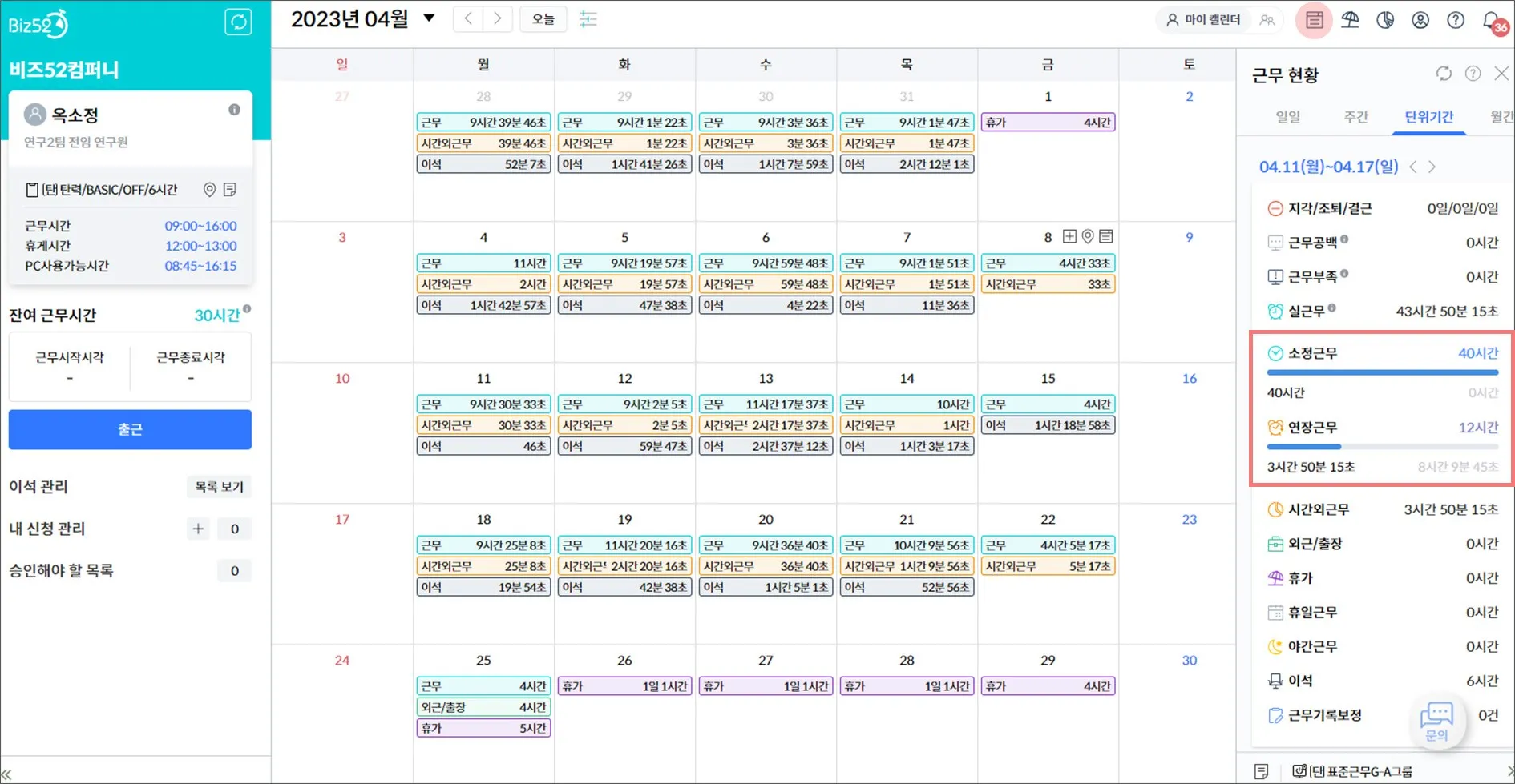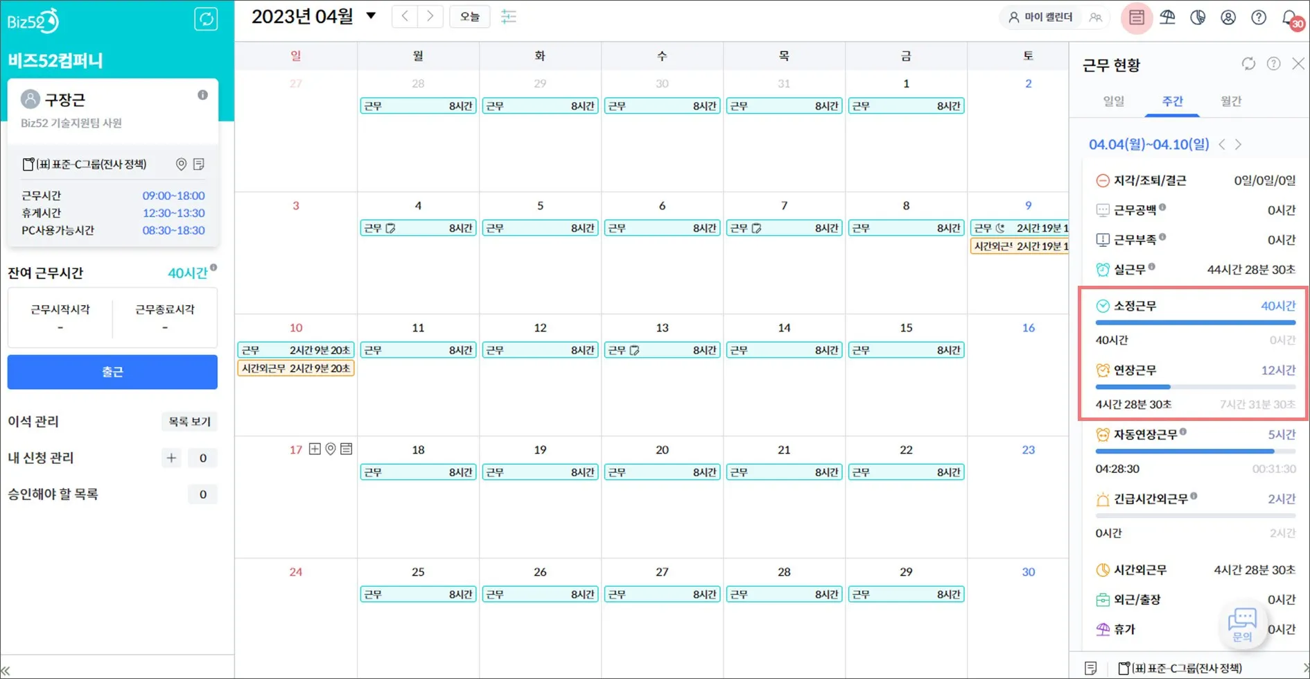 “소정근무시간” 바 그래프 추가: 표준근무제라면, 주간 근무현황에 40시간 바 그래프가 나타나요.