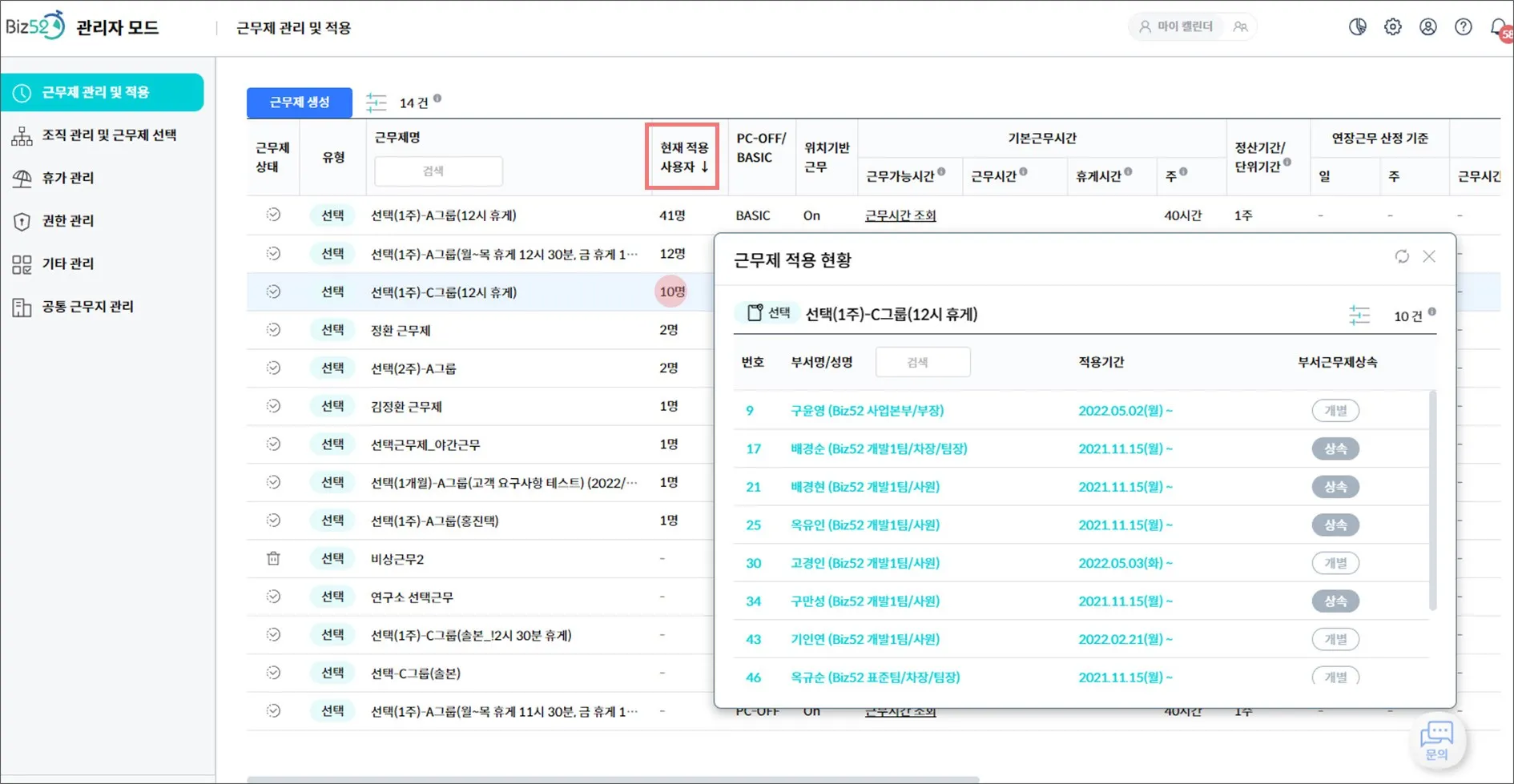 5. [관리자 모드>근무제 관리 및 적용] "현재 적용 사용자" 컬럼 추가