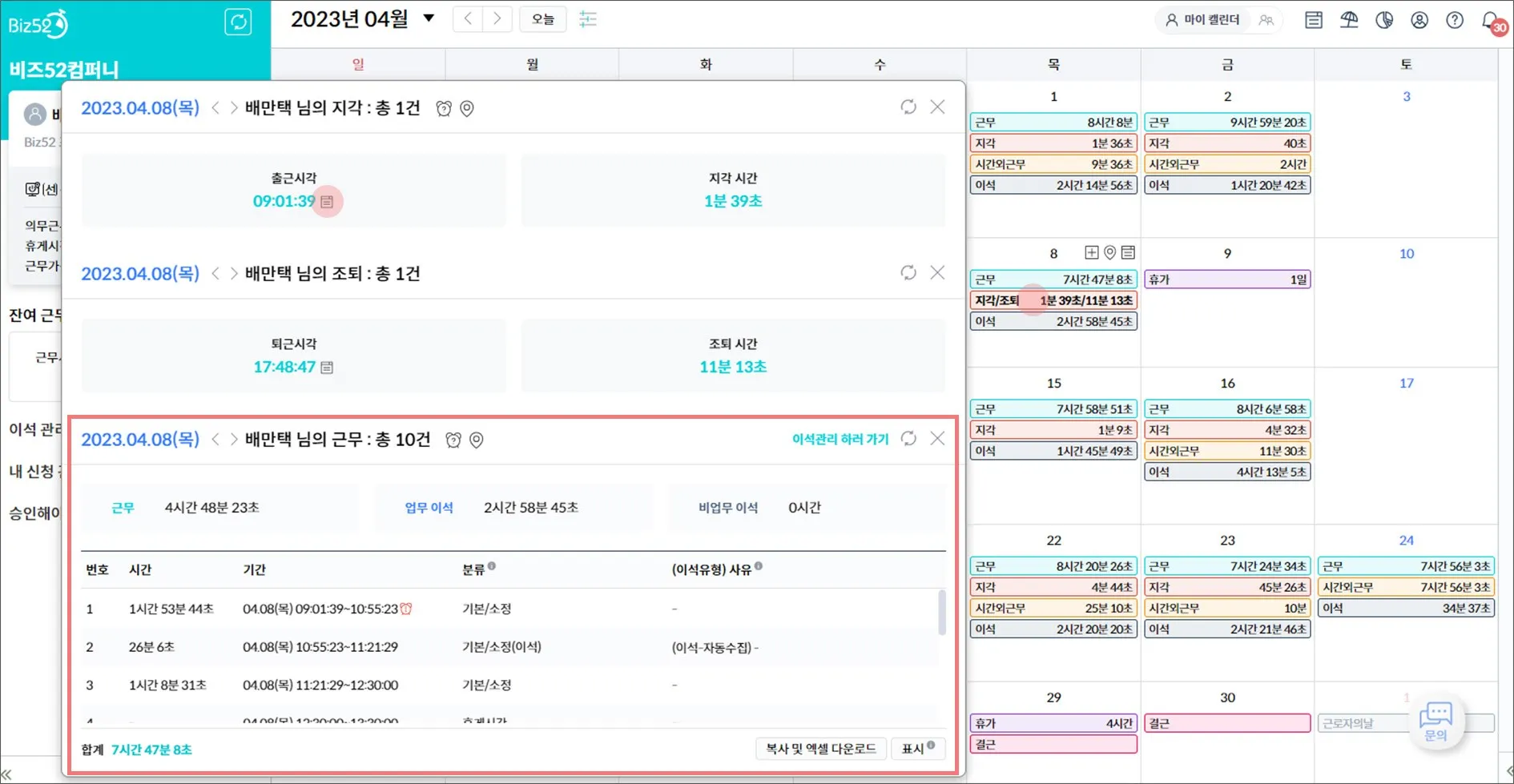 막대바 클릭하여 상세 창을 열면 이미 이중창으로 표시가 되는 터라 추가적인 상세 근무 현황을 확인할 수 없었는데요,