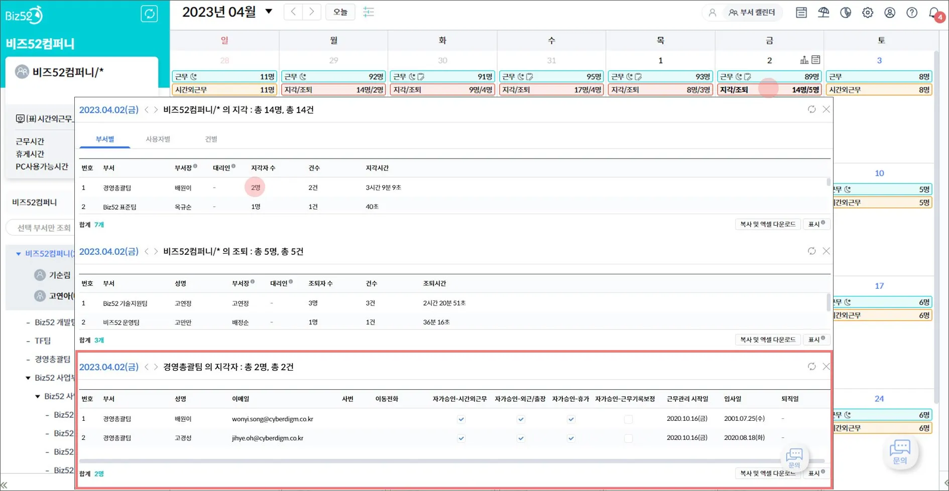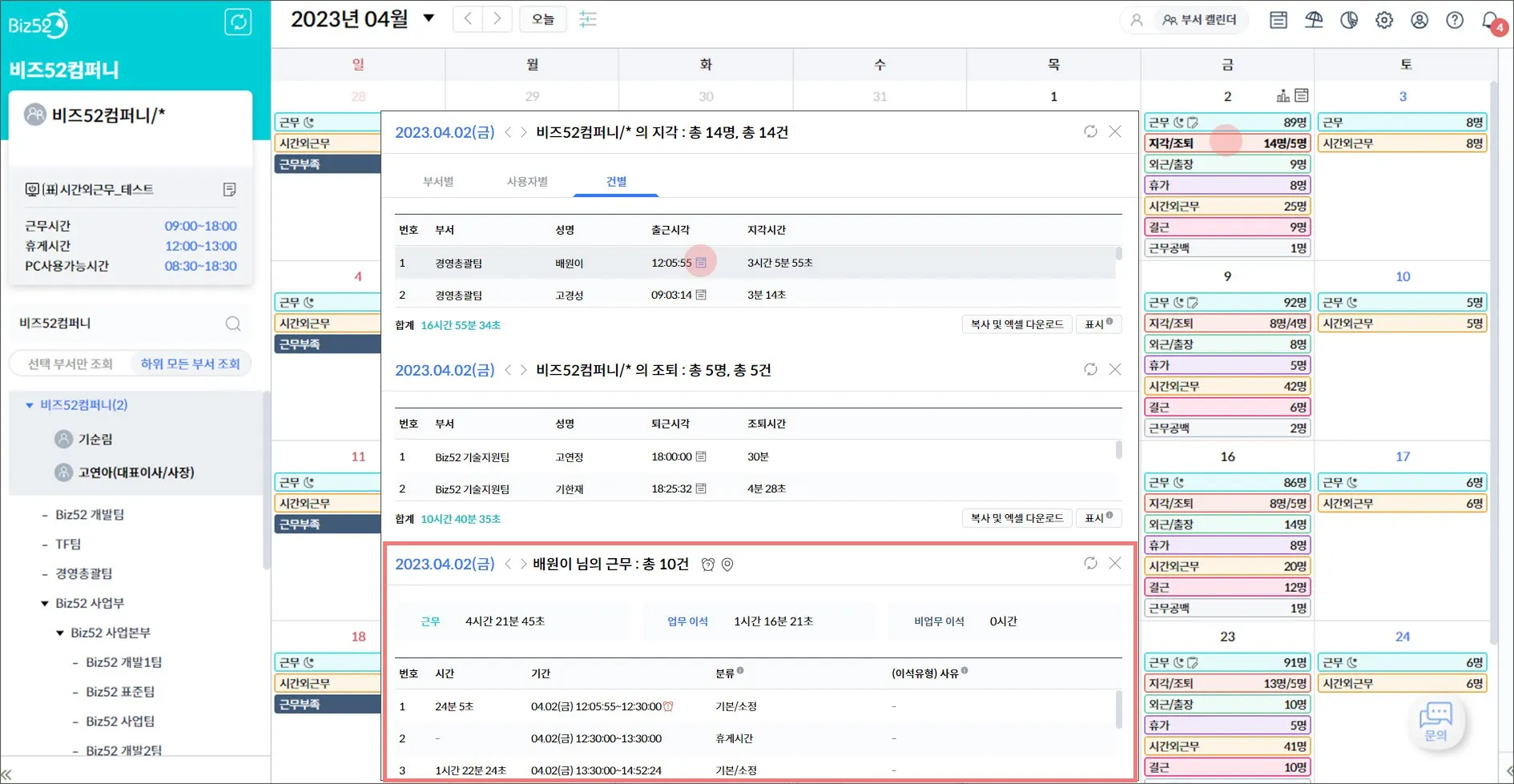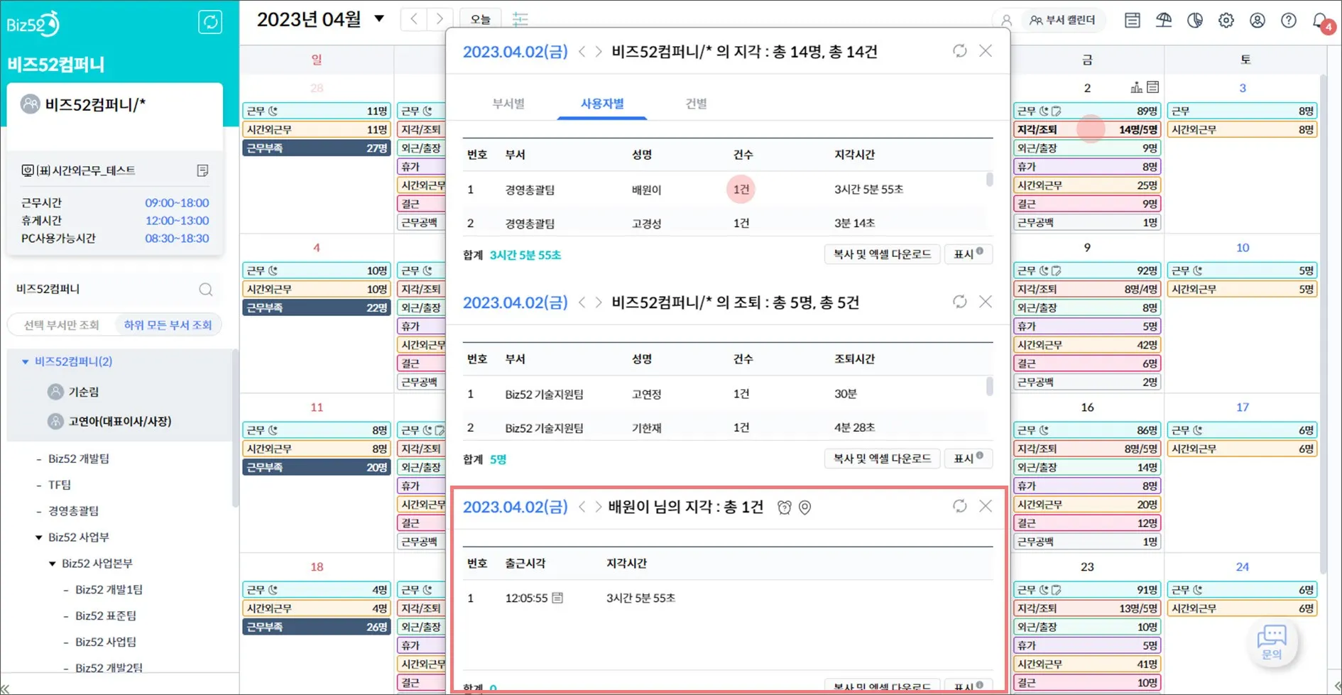 부서별/사용자별 상세 현황을 모두 3중창으로 변경하여 근무 상세 현황과 함께 사용자의 당일 근무 기록을 손쉽게 확인할 수 있도록 하였습니다.
