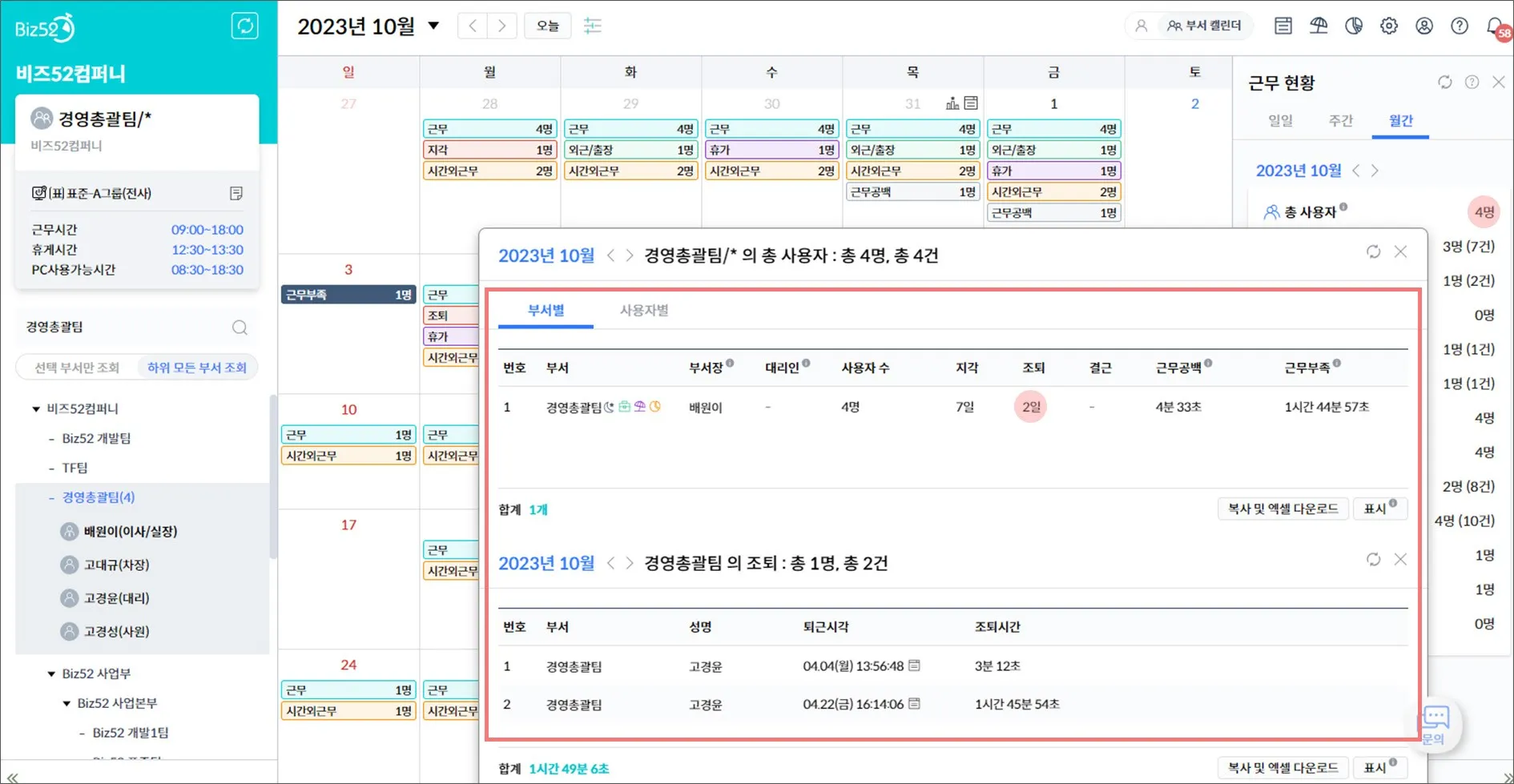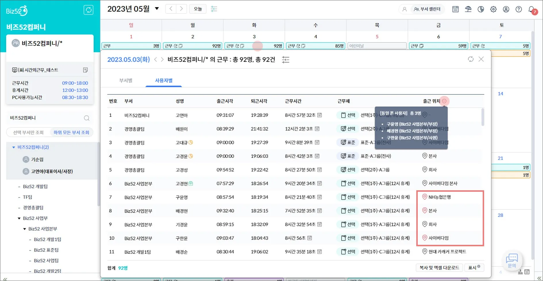 기존 Biz52의 부서 캘린더에서 “총 사용자” 상세 현황 창의”부서별” 탭에서는 상세 현황이 툴팁으로 제공되었는데요.