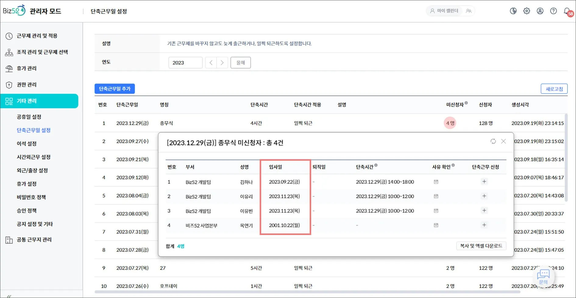 관리자 모드> 기타 관리> 단축근무일 설정에서 “미신청자” 클릭 시 나타나는 창에 “입사일”을 추가하였습니다.