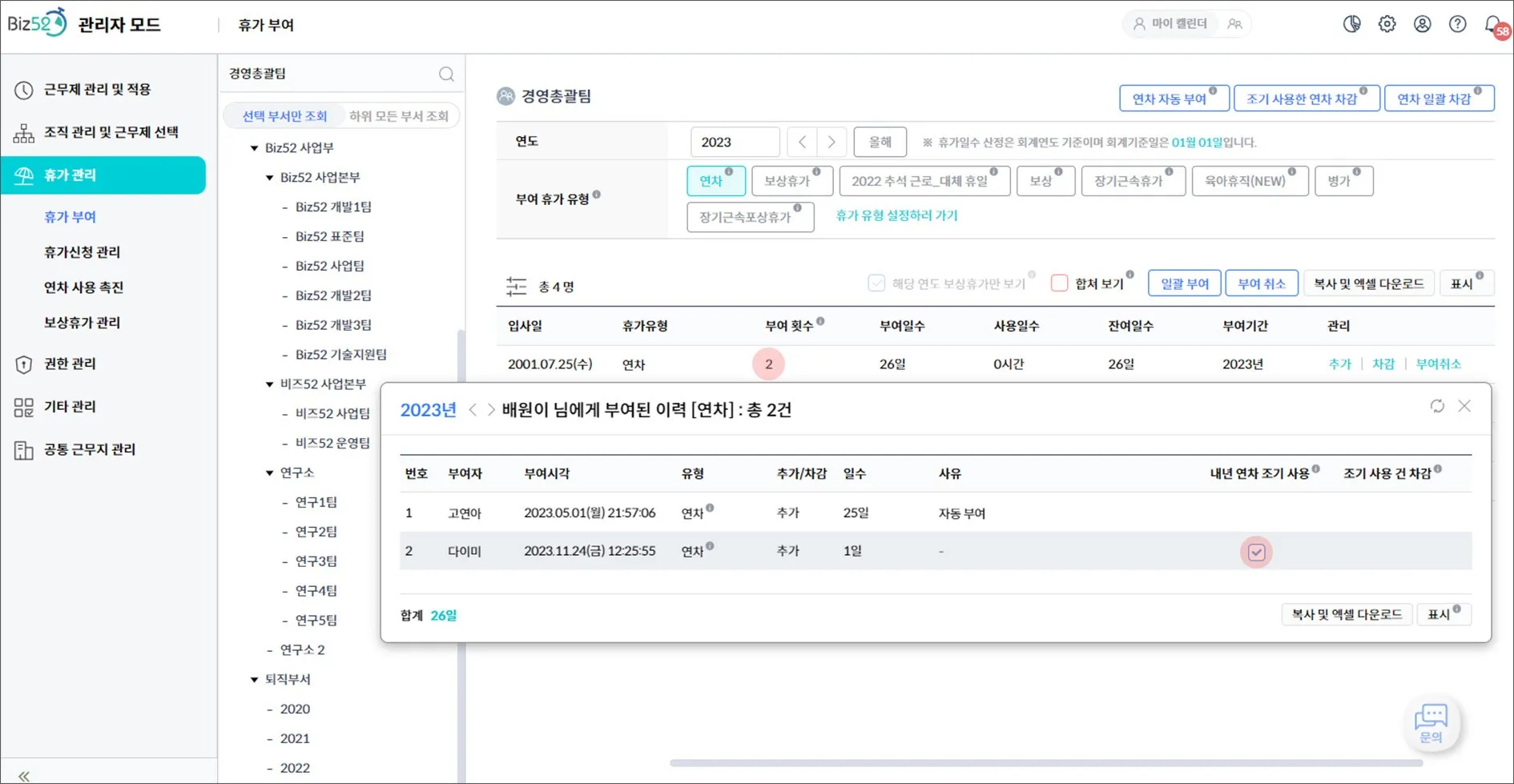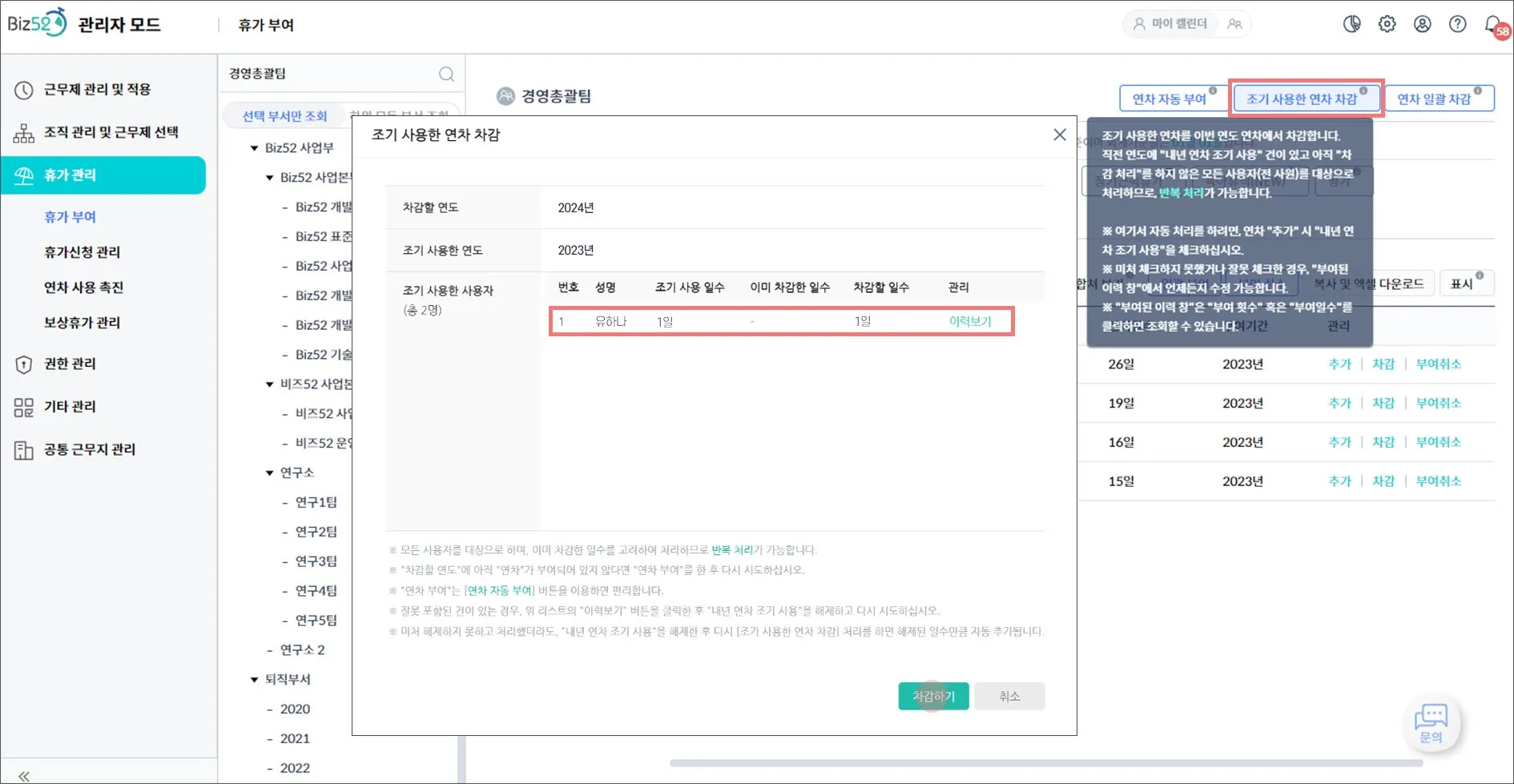 Biz52가 수고를 덜어드리고자 “조기 사용한 연차 자동 차감” 기능을 추가하였습니다!