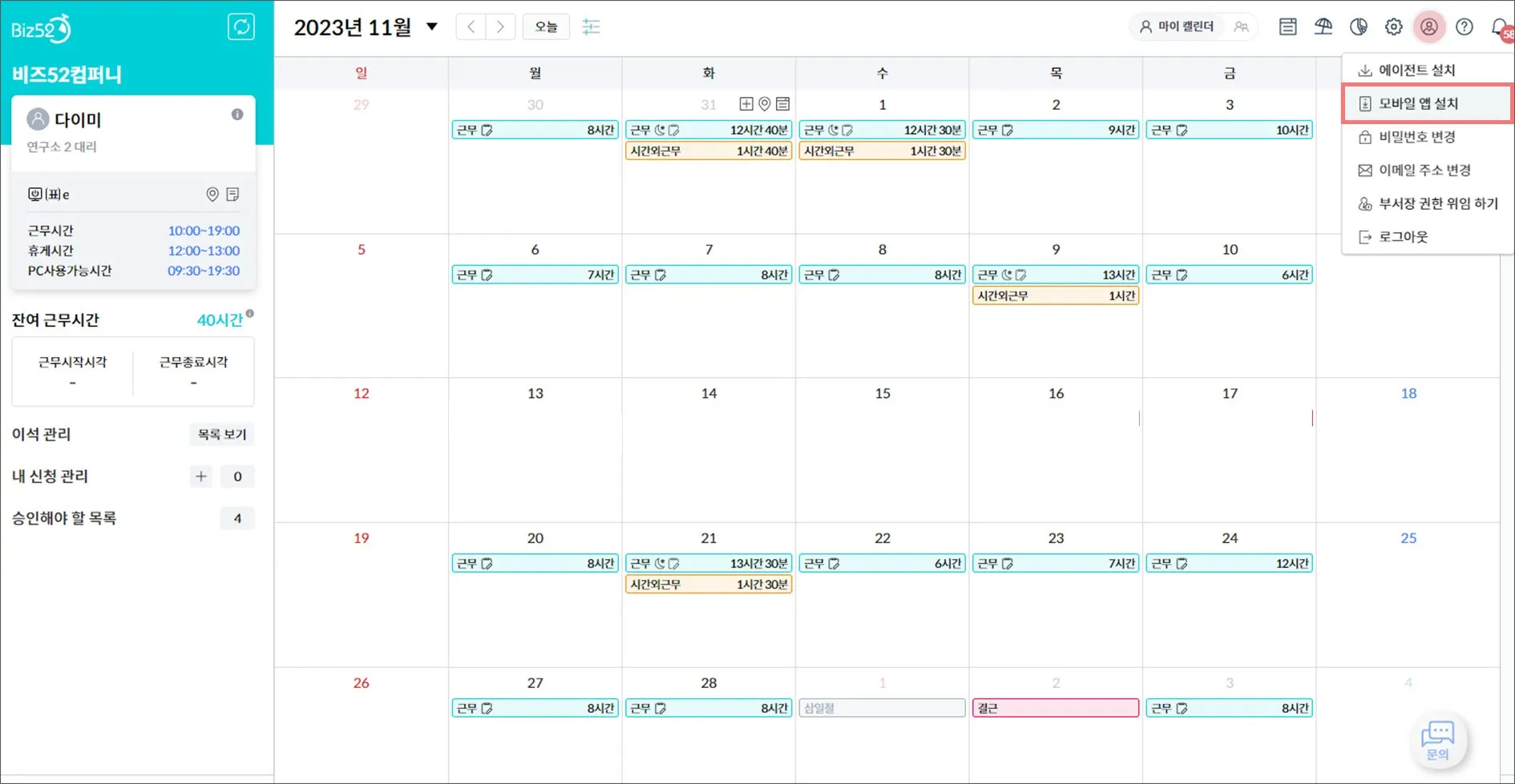 Biz52 웹 캘린더에서 사람 모양의 아이콘> 모바일 앱 설치 메뉴 클릭 시