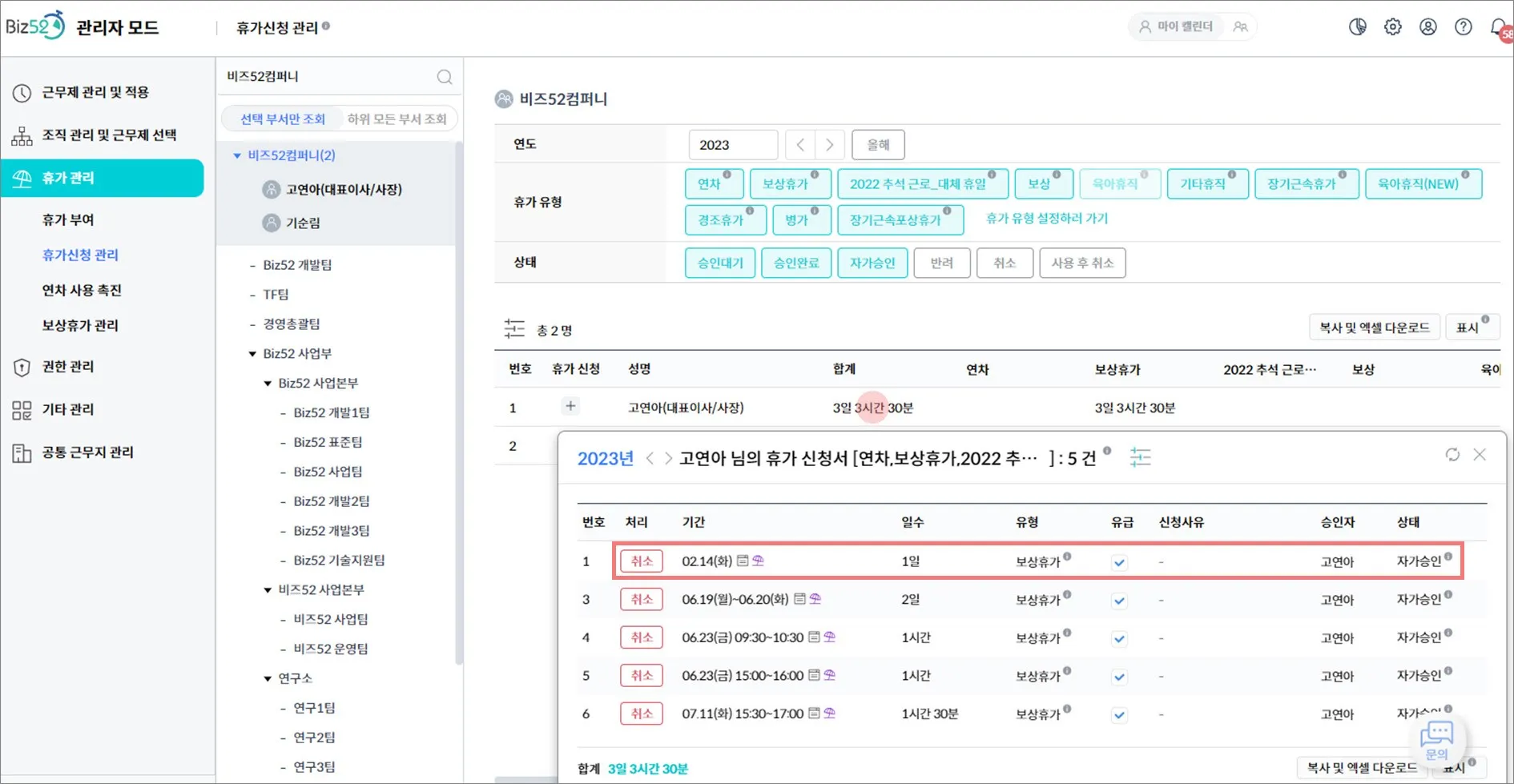 [관리자 모드 > 휴가 관리> 휴가신청 관리]를 통해