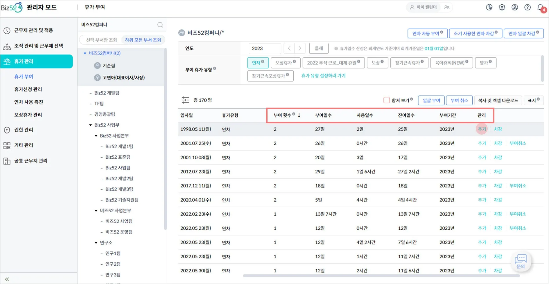 Biz52 사용 전 이미 사용한 휴가를 쉽게 관리할 수 있도록 “연차 일괄 차감” 기능을 추가했습니다!