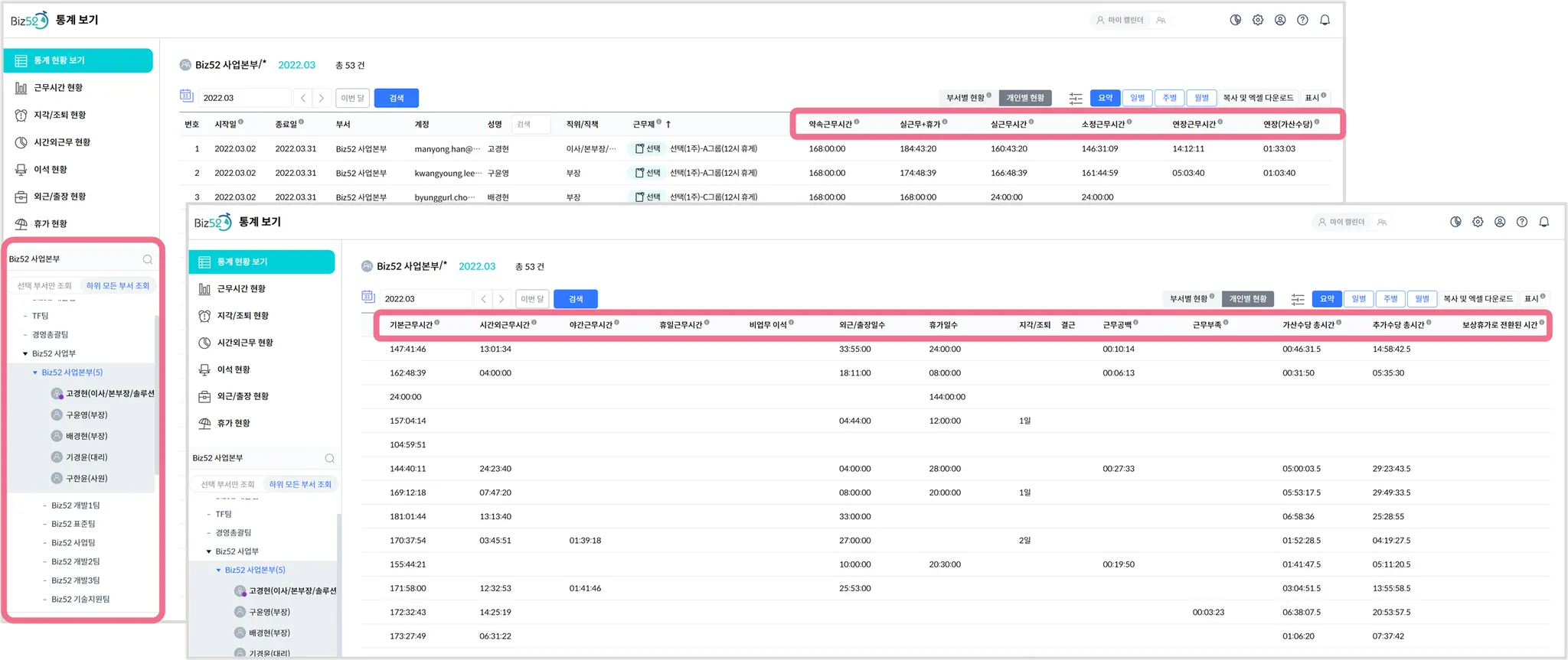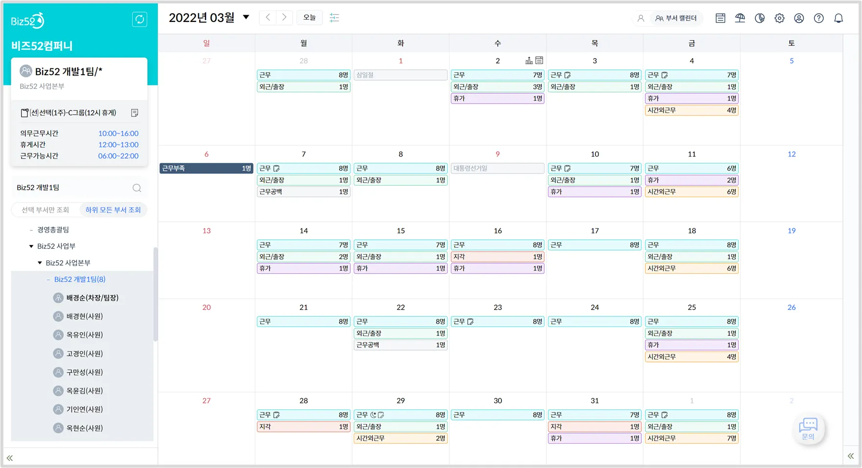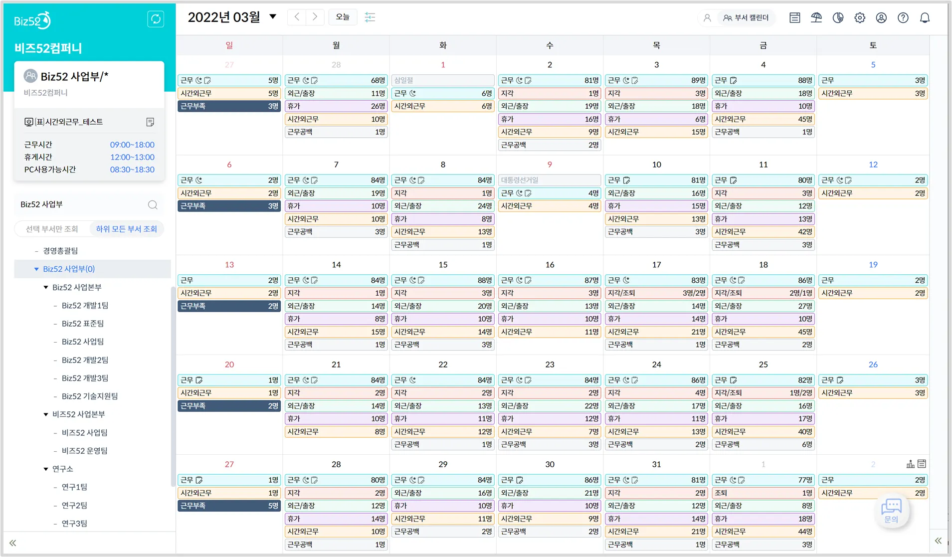 비즈52는 부서 캘린더에서 전체 사용자의 실시간 근무 현황 및 상세 근무 데이터를 확인할 수 있습니다. 하지만, 부서캘린더 오픈 범위에 따라 관리자와 사용자의 화면이 달라지게 되죠.