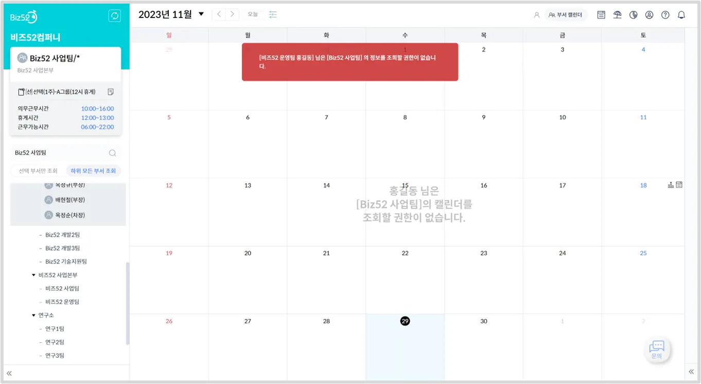 ‘부서장만 조회’ 옵션 적용 시 부서장의 타 부서의 [부서 캘린더] 클릭 시 안내 메세지
