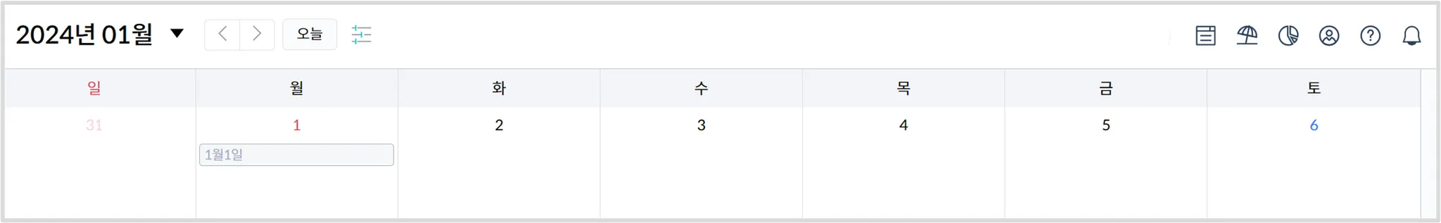 ‘공유 안함’ 적용 시 관리 권한이 없는 부서장과 사용자는 부서원의 캘린더 확인이 불가능해 개인 캘린더에서 [부서 캘린더]로 이동할 수 있는 탭이 표시되지 않습니다.