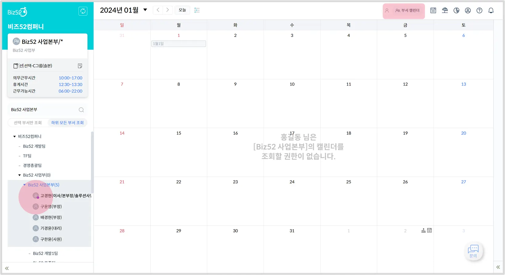 ‘부서장만 조회’ 적용 시 부서장은 본인이 속한 부서에 있는 사용자들의 [부서 캘린더]만 확인할 수 있습니다.
