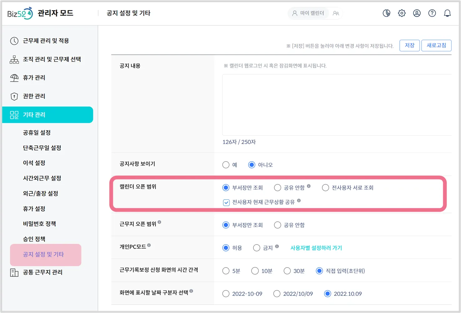 ‘전 사용자 서로 조회’ 옵션의 경우, 관리자와 모든 사용자가 부서 캘린더를 조회할 수 있습니다.