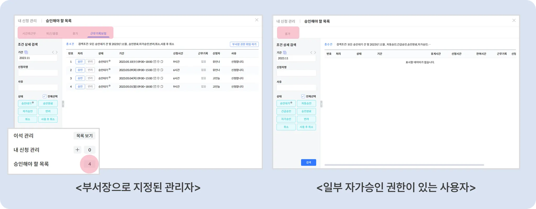 ‘내 신청 관리’는 관리자, 사용자 모두에게 제공되는 기능이지만, ‘승인해야 할 목록’의 경우에는
