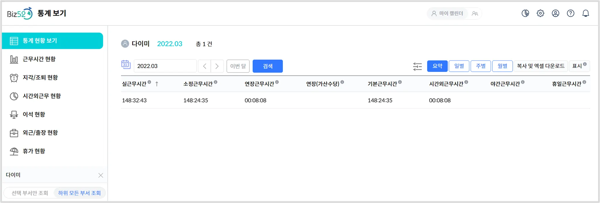 Biz52의 통계 보기에서는 사용자의 실 근무 시간, 연장 근무 시간, 외근/출장 일수, 근무 부족시간 등 실제 근무한 기록을 반영한 데이터를 확인할 수 있고, [복사] 기능을 활용하여 엑셀에 손쉽게 정리할 수 있습니다.