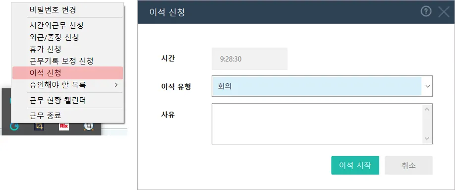 갑작스런 회의를 마치고 사용자가 자리로 돌아와 PC를 사용하려 할 때, 이석 시간과 함께 이석 유형, 사유를 입력하는 창이 발생합니다. 이 때, 이석 유형을 상황에 맞게 ‘회의’로 유형을 선택하고 사유를 입력하면 업무 이석으로 기록되어 근무시간에 포함됩니다.