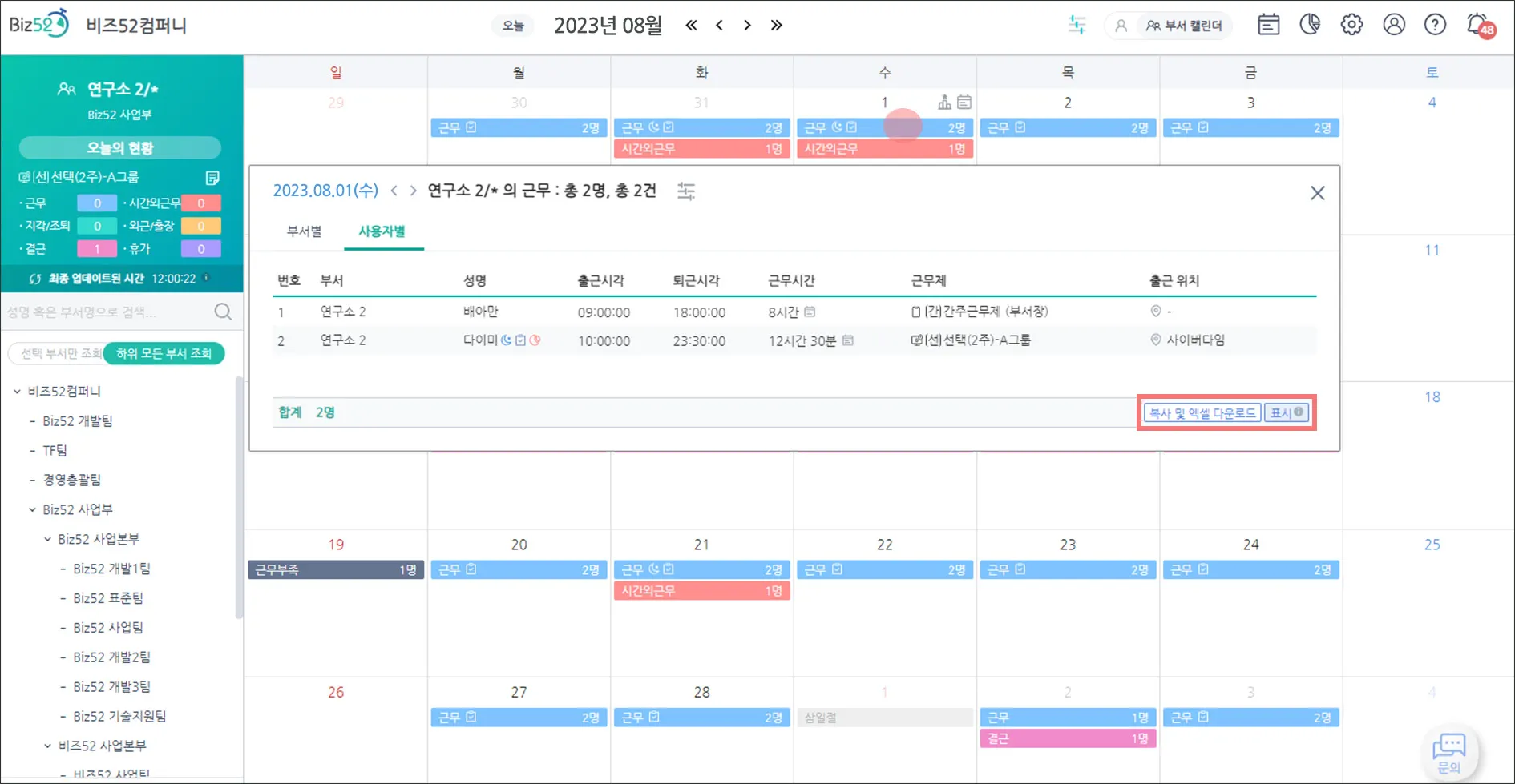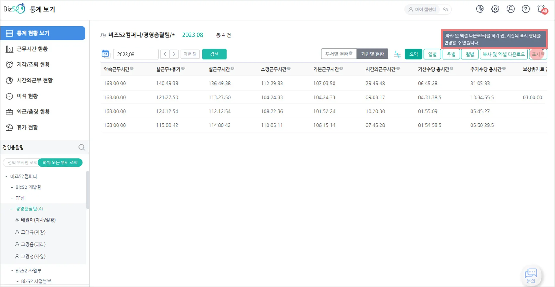 Biz52 화면마다 복사 및 엑셀 다운로드 버튼을 제공하고 있는데요.