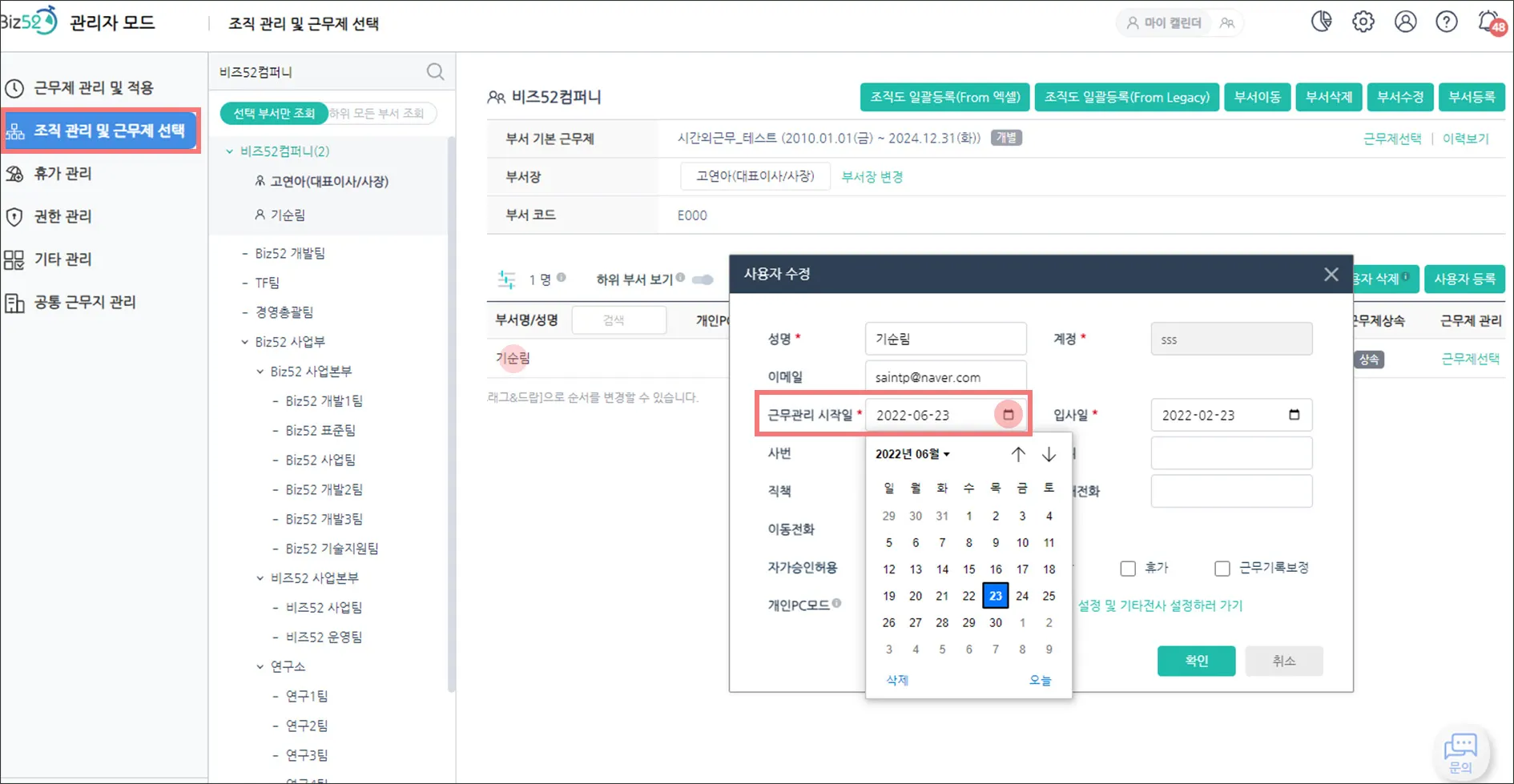 6. [관리자 모드] 사용자의 "근무관리 시작일" 아주 먼 과거로 변경 가능