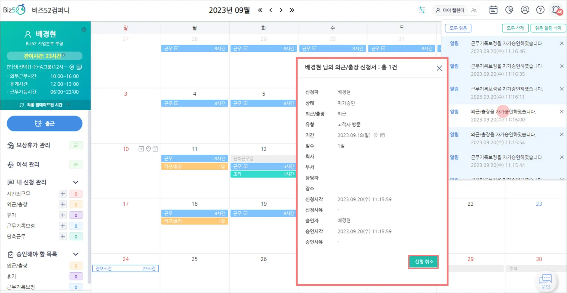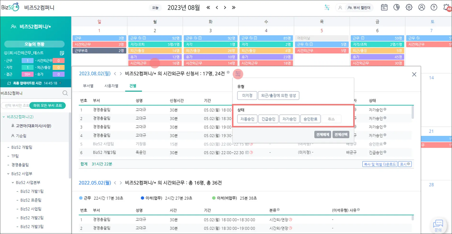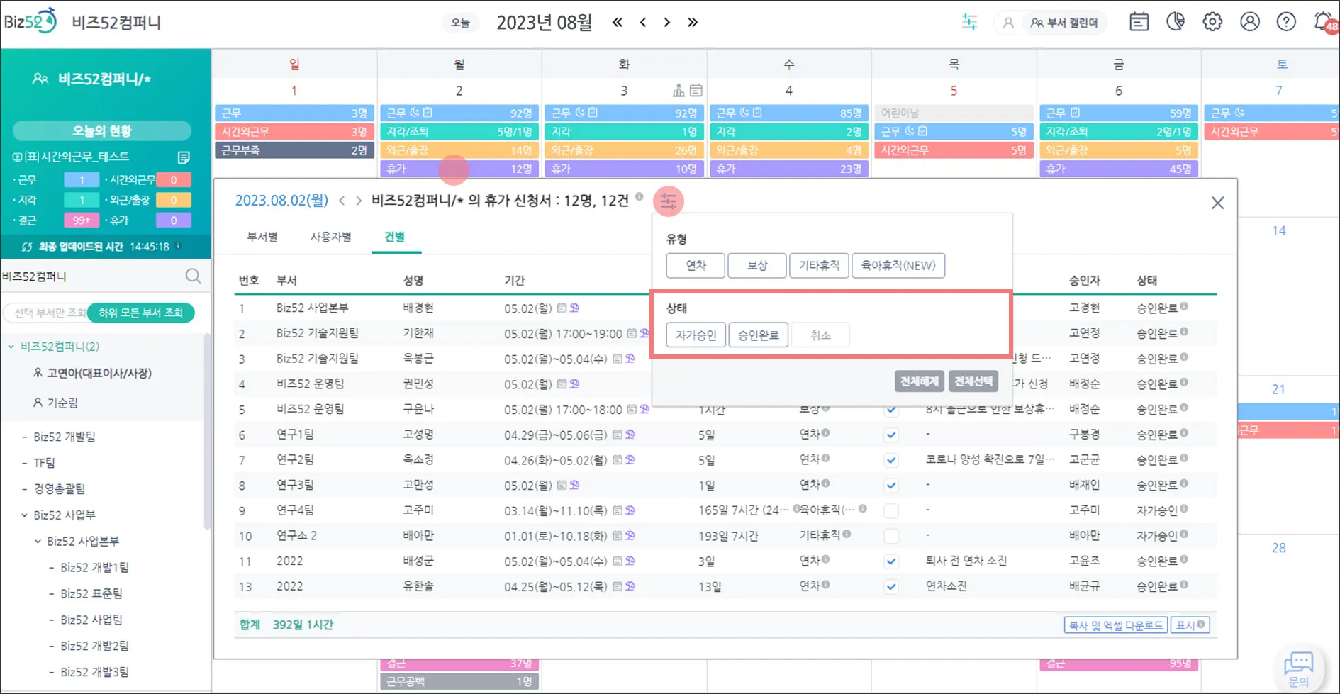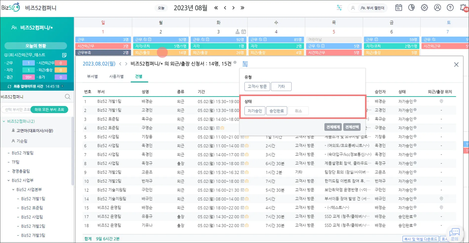 이번 Biz52 업데이트로 자가승인/승인완료/승인대기/반려/취소/사용후 취소 등 모든 건을 확인할 수 있게 되었습니다.
