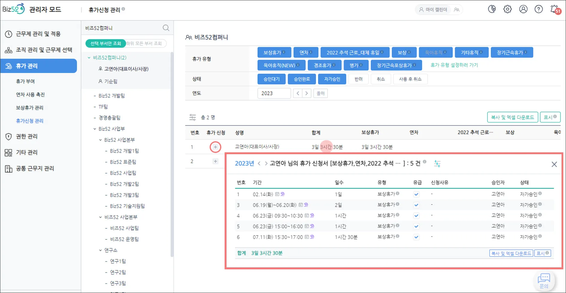 [관리자 모드 > 휴가 관리] 휴가신청 관리 메뉴가 추가되었습니다.