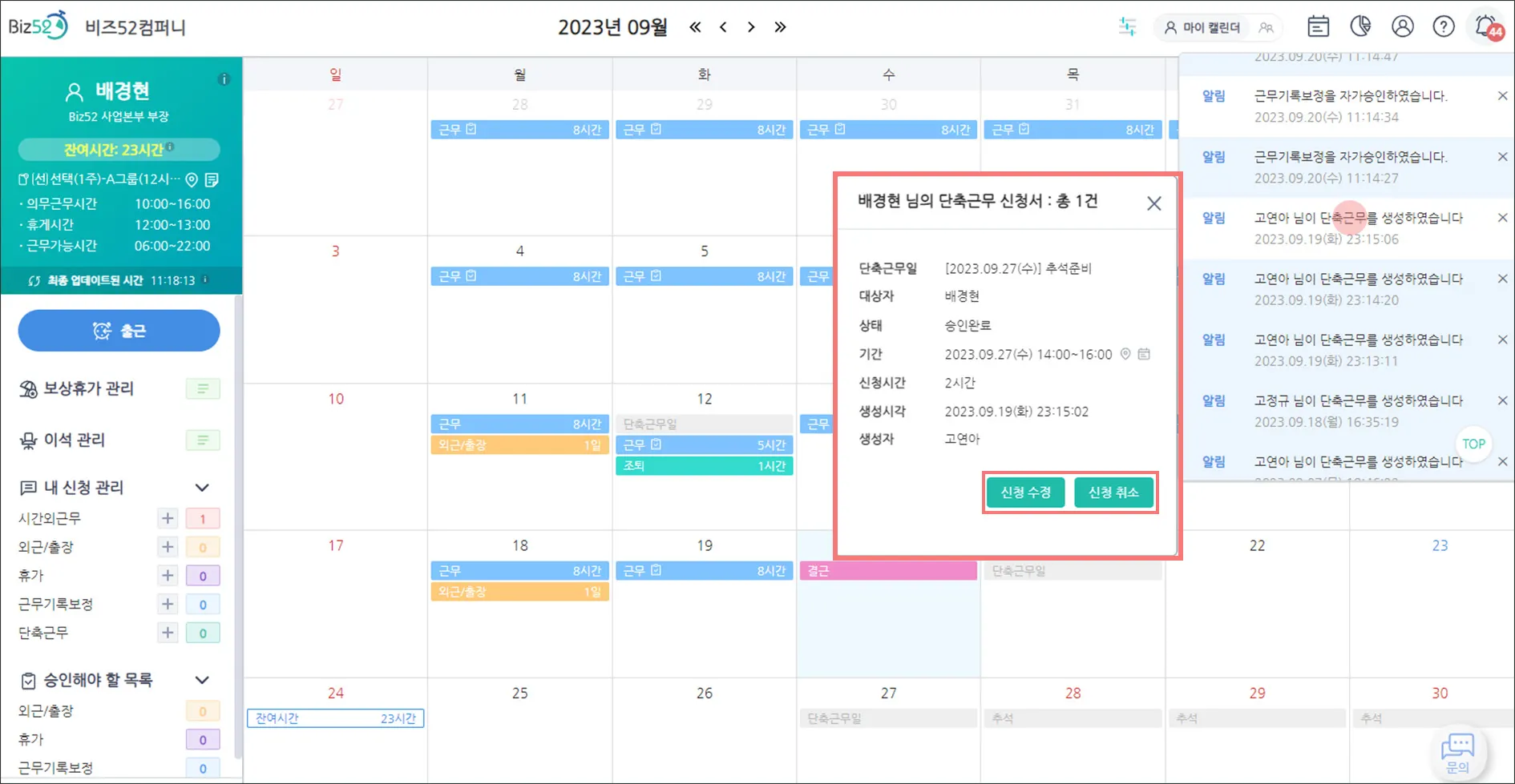 - 웹 캘린더의 신청서 조회 창에 [신청 취소], [신청 수정], [신청] 버튼이 추가되어, “내 신청 목록”으로 이동하지 않고도 원하는 작업이 가능해졌습니다.