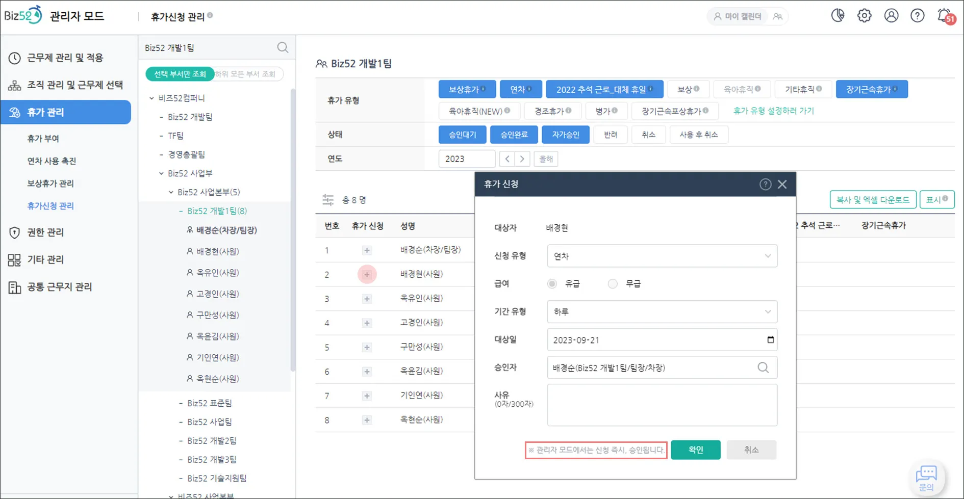 관리자가 사용자의 휴가를 등록해 주는 것도 가능하게 되었습니다!!