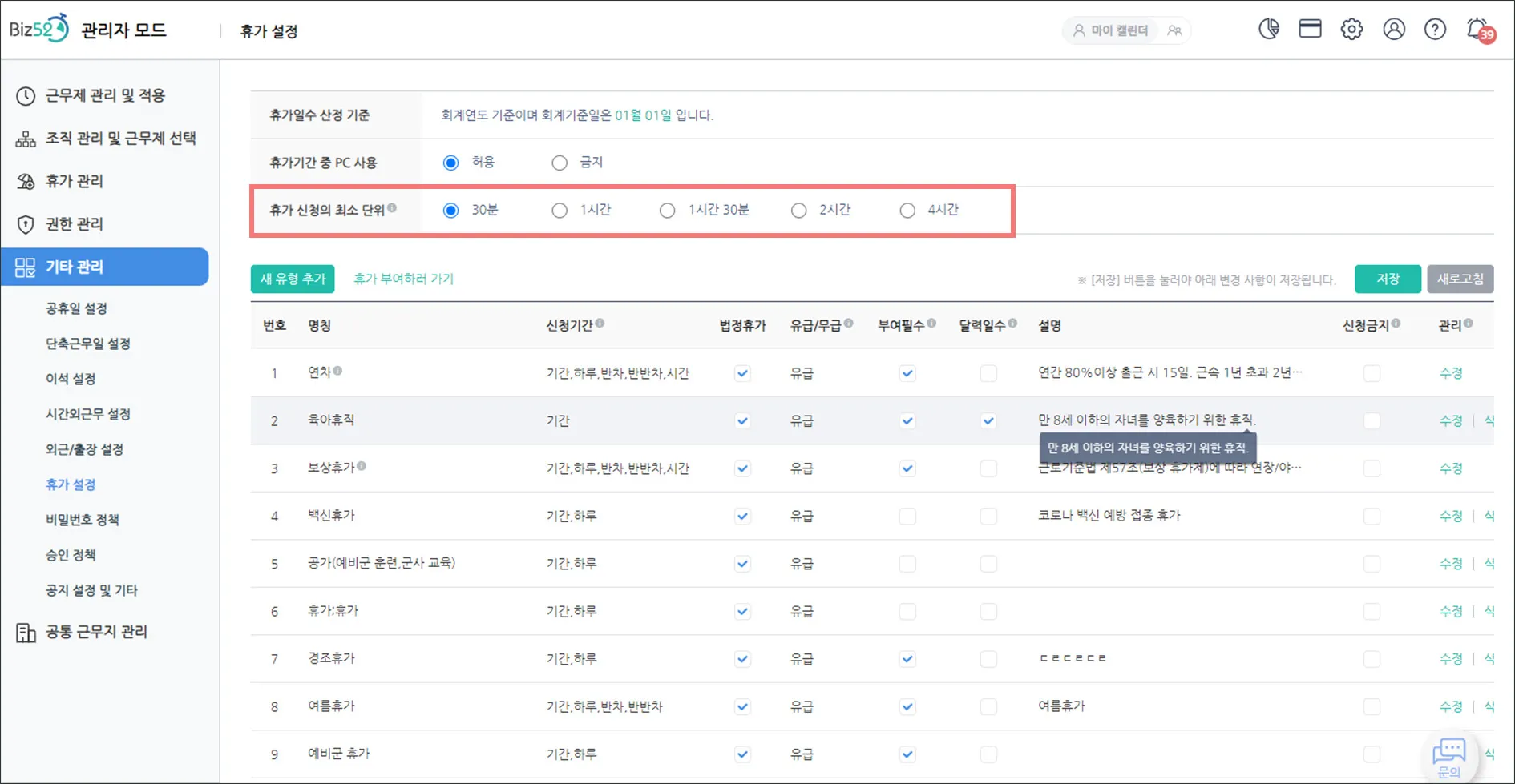 지난 번 업데이트에서 각 회사마다 휴가 신청에 최소 시간을 규정할 수 있는 “휴가 신청 최소 단위” 옵션 추가에 이어