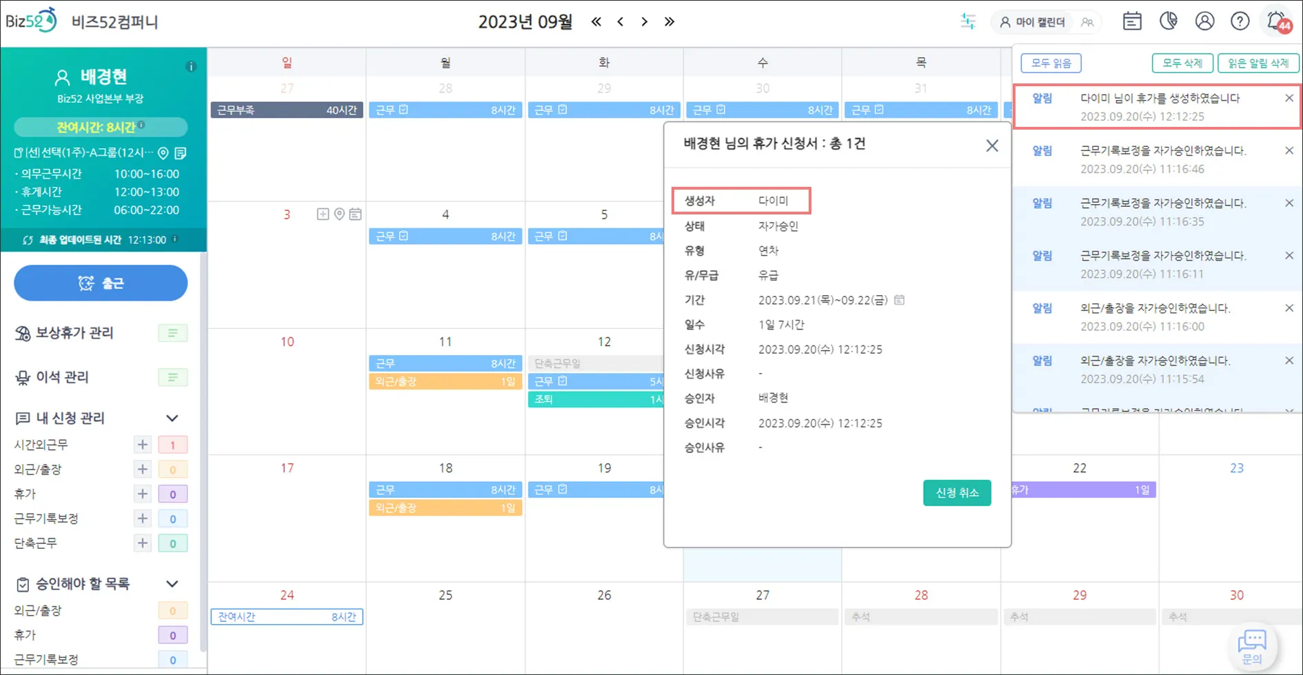 관리자가 휴가를 등록한 경우, 사용자 본인/승인자/부서장에게  알림 메세지가 발송되며, 휴가 생성자에는 관리자의 이름이 표시됩니다.