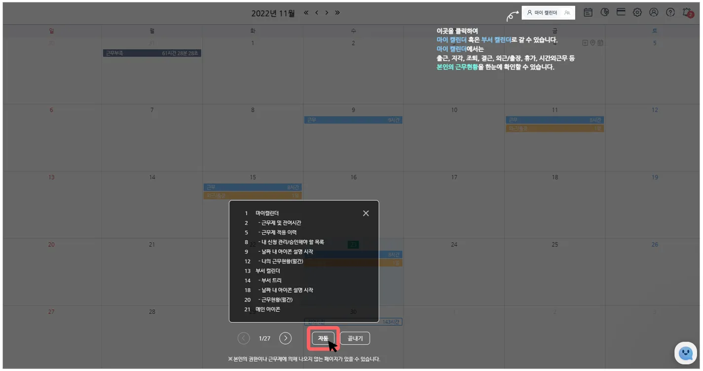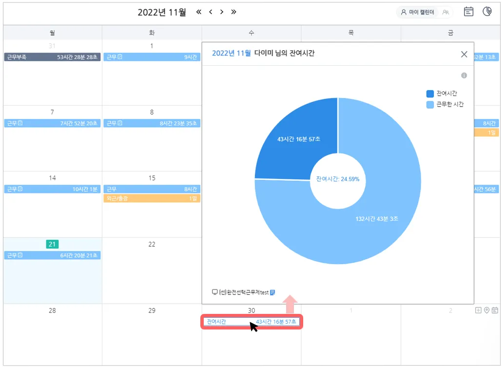 지금 근무 중인 기간의 마지막날엔 잔여시간 막대가 표시되는 점 잊지마세요!