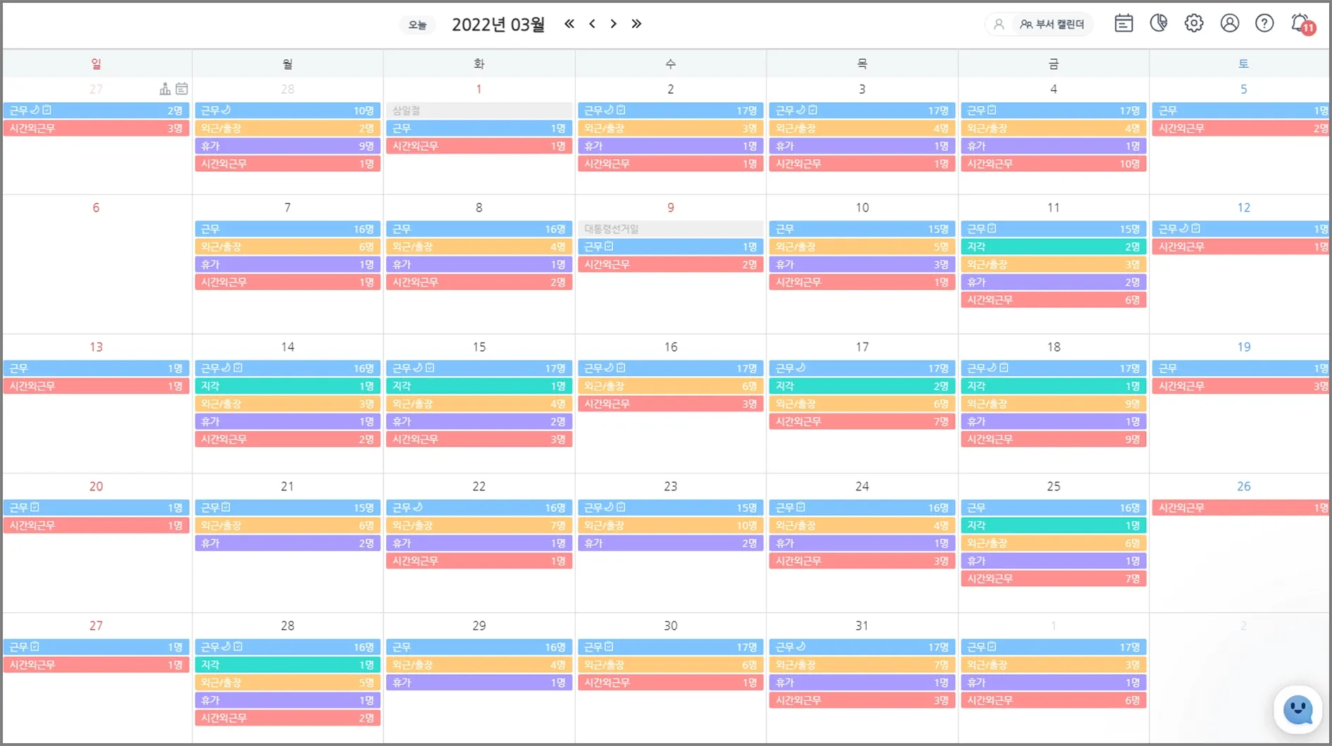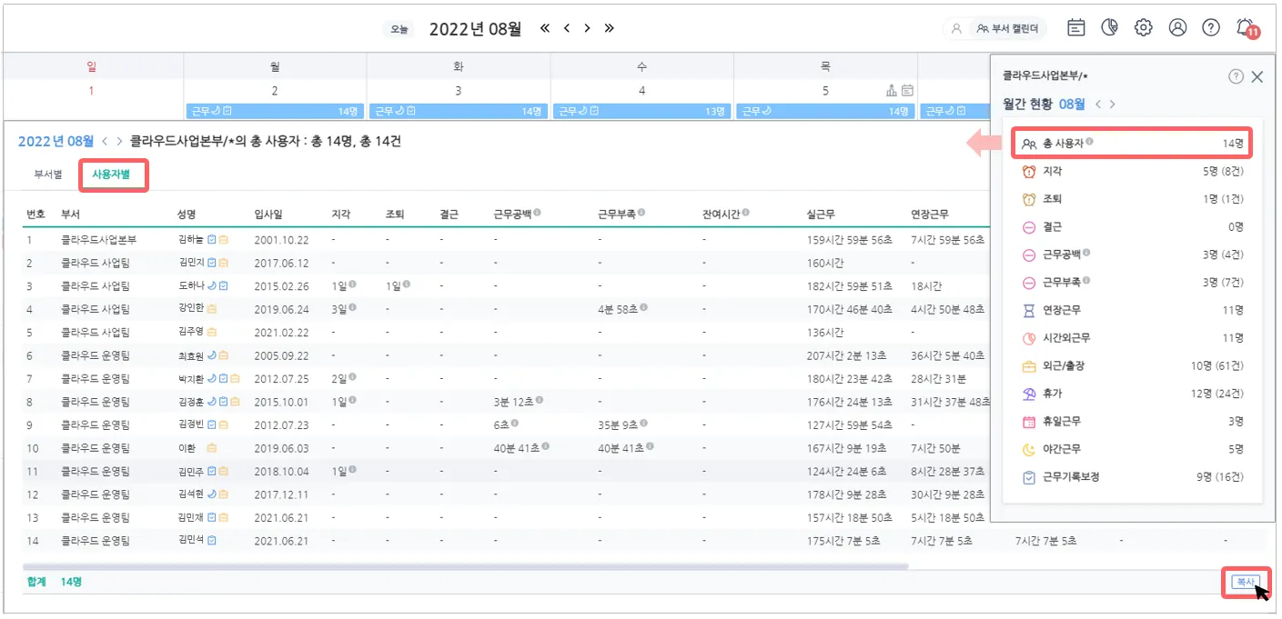 [부서 캘린더] > 일일 현황/주간 현황/월간 현황 > 총 사용자 > 사용자별 탭에서 부서원 또는 전체 구성원의 현황을 한 눈에 확인할 수 있죠!