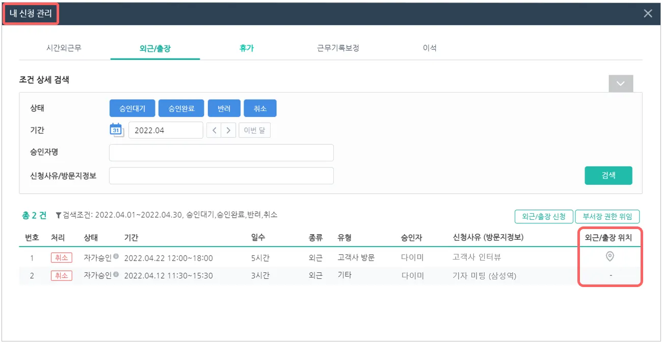 내 신청 관리 / 승인해야 할 목록 에서는 다양한 조건으로 외근/출장 신청서 검색이 가능하고, 마찬가지로 위치 아이콘 클릭 시 지도에 정확한 위치가 확인되죠.