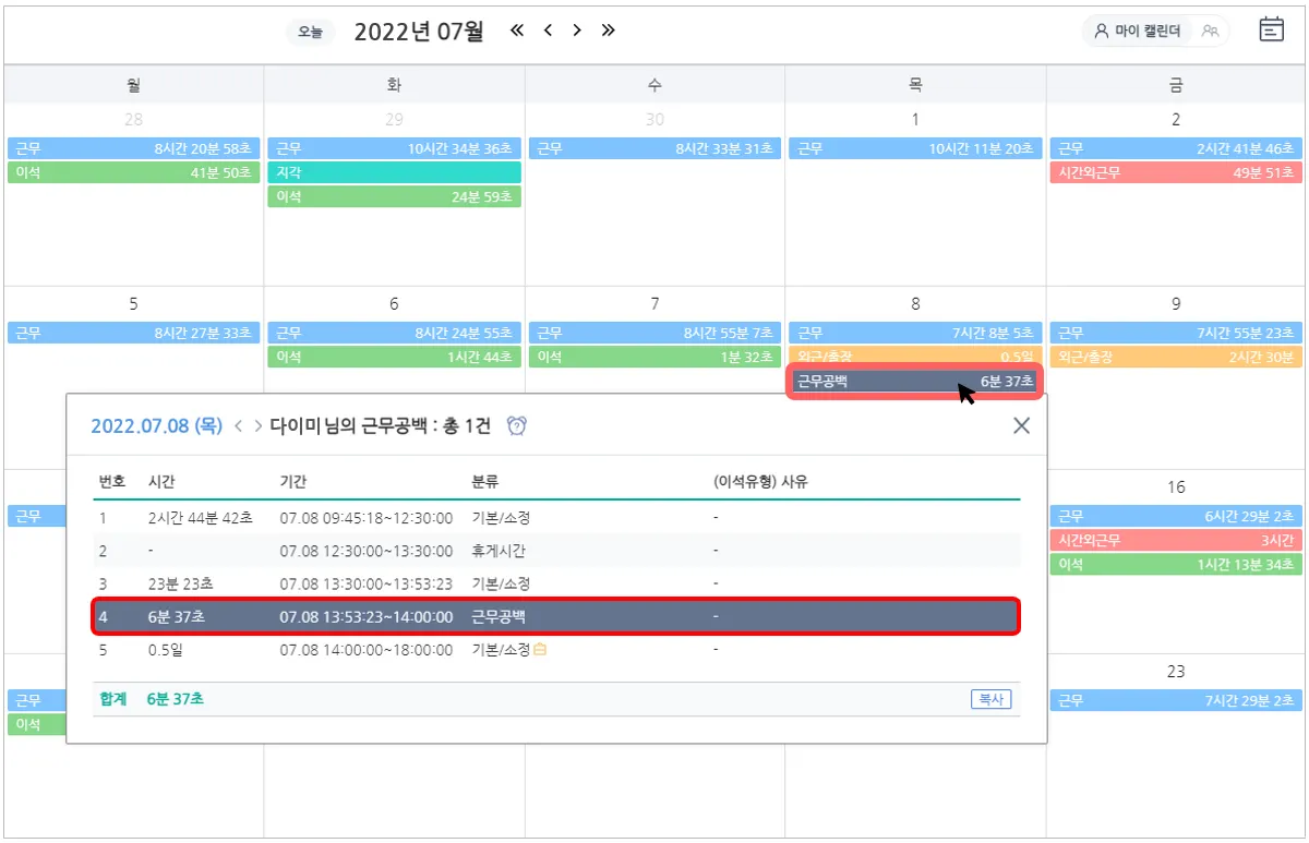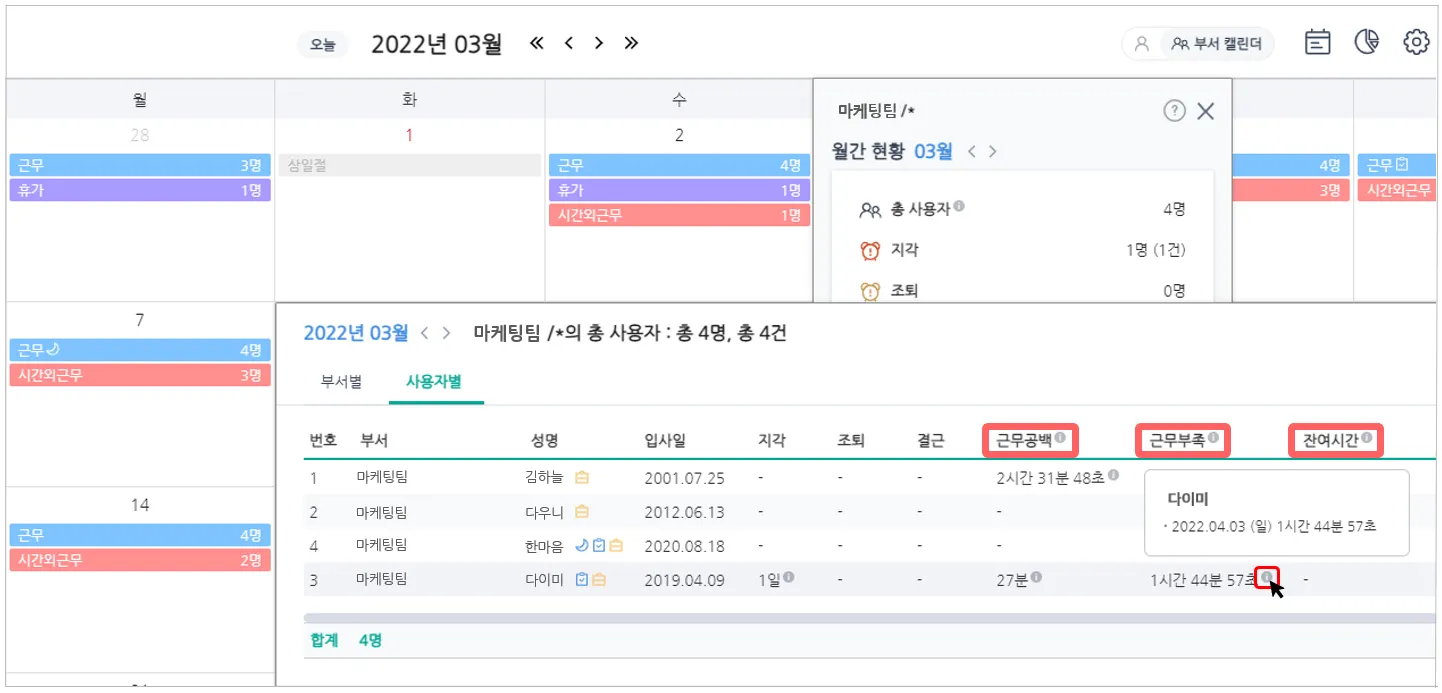 사용자의 [마이 캘린더]에 추가된 근무공백/근무부족/잔여시간 항목은 [부서 캘린더]의 상세 현황 보기 기능에도 추가되어 더욱 편리한 근태 관리가 가능합니다.