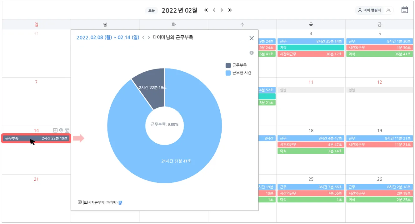 근무부족은 정산 기간의 마지막 날 캘린더에 나타납니다. 막대를 클릭하면 근무부족 상황을 그래프로 확인할 수 있습니다!