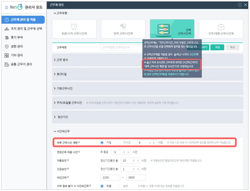 ‘하루 근무 시간 제한 기능’은 관리자 모드 > 근무제 생성 > 선택 근무시간제 > 시간외근무 탭에서 설정 가능하며, 선택 근무제에 한해서만 사용할 수 있습니다.