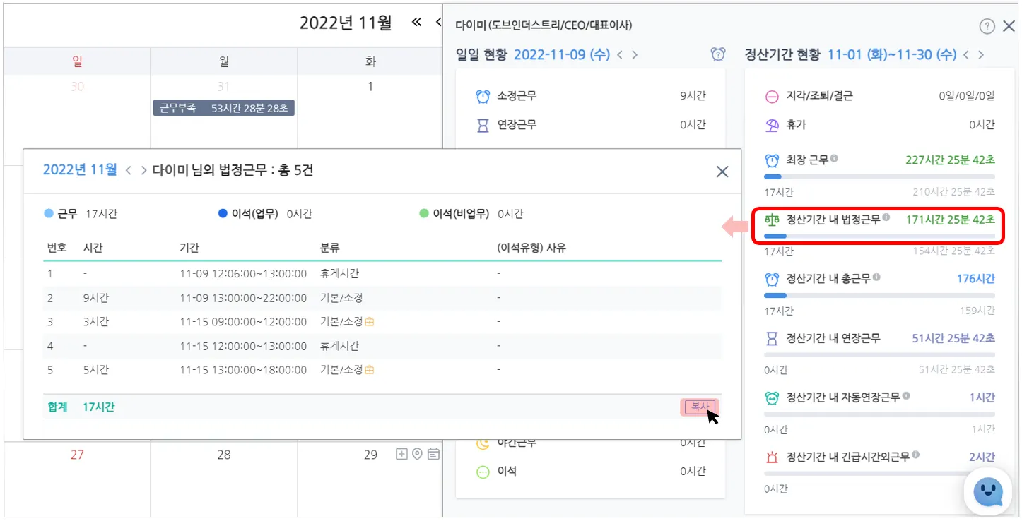 기존 통계보기에서만 가능했던 근무 데이터 복사 기능이 비즈52 웹 캘린더의 상세 내역 팝업에도 추가되었습니다