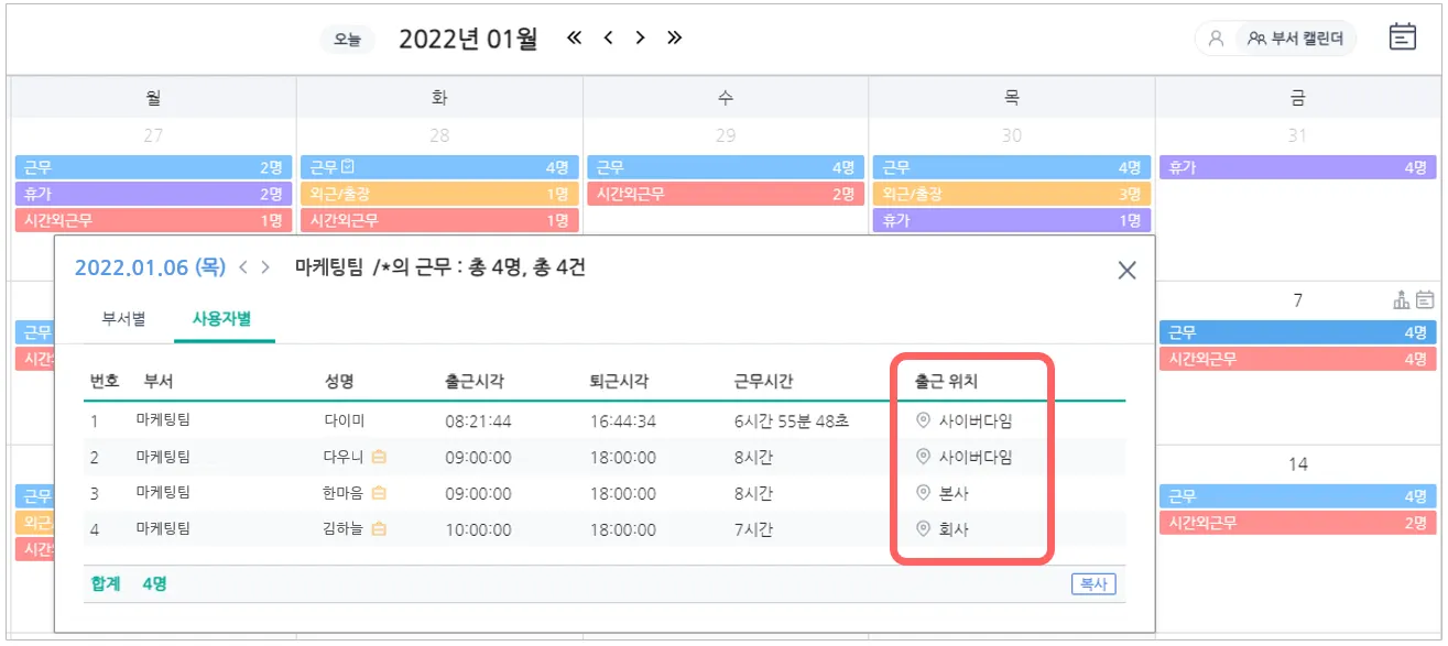 [부서 캘린더]에서 근무 막대바 > 사용자별 탭을 선택하면, 출·퇴근 시간/근무 시간/출근 위치를 확인할 수 있었는데요.
