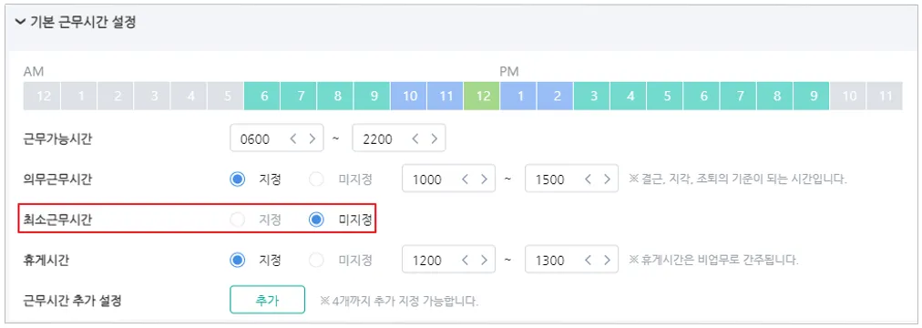 활용도가 낮았던 “최소 근무 시간” 항목은 삭제되었습니다.